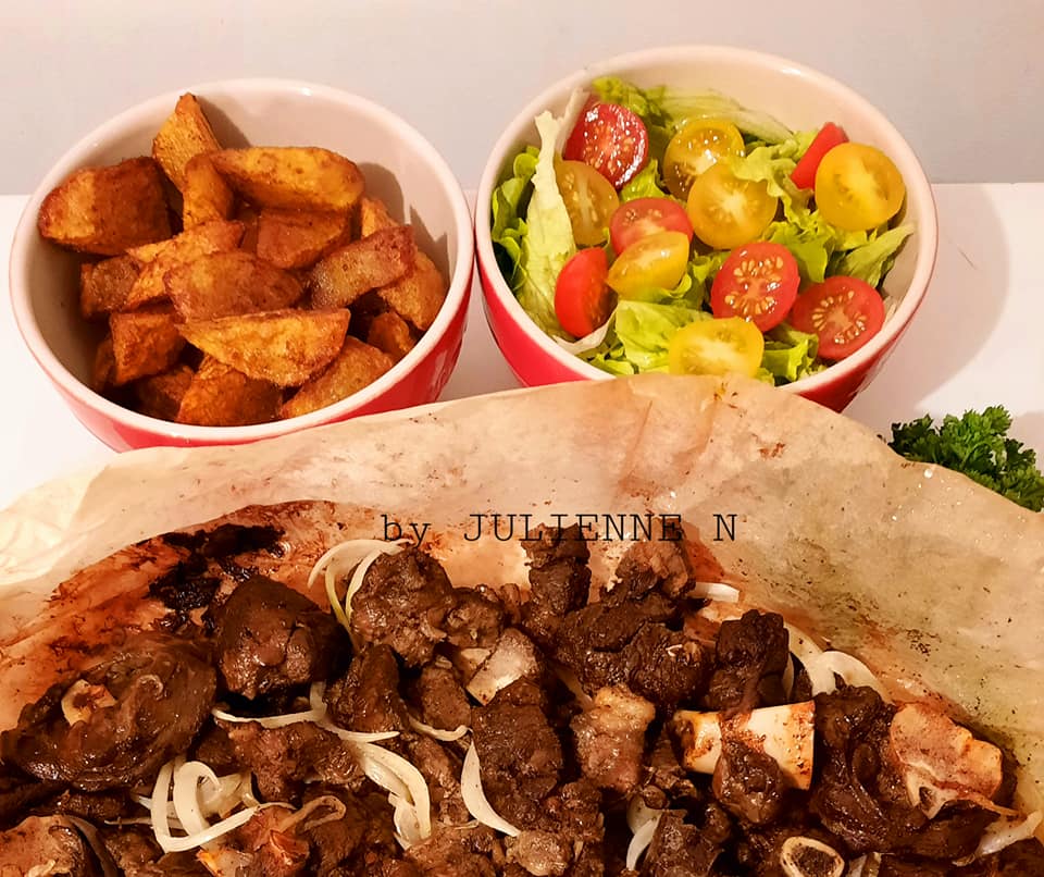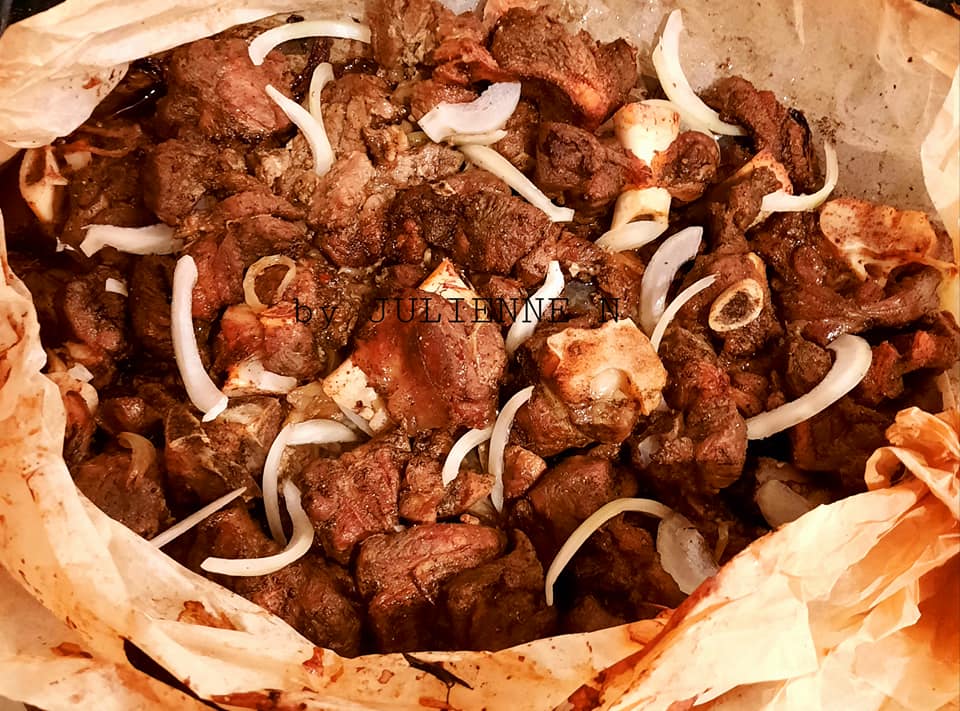 - En général, la viande est juste assaisonnée de sel et poivre mais cuisine by JULIENNE N, assaisonne la viande avec une cuillère à soupe rase de persillade, deux cuillères à soupe de citron jaune, sel poivre, au moins 1h00 avant la préparation et garder au réfrigérateur. Laver la viande, au préalable.