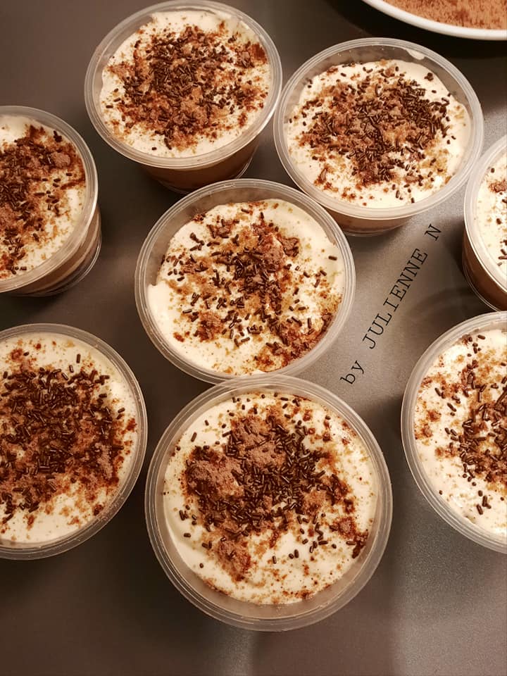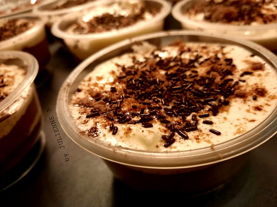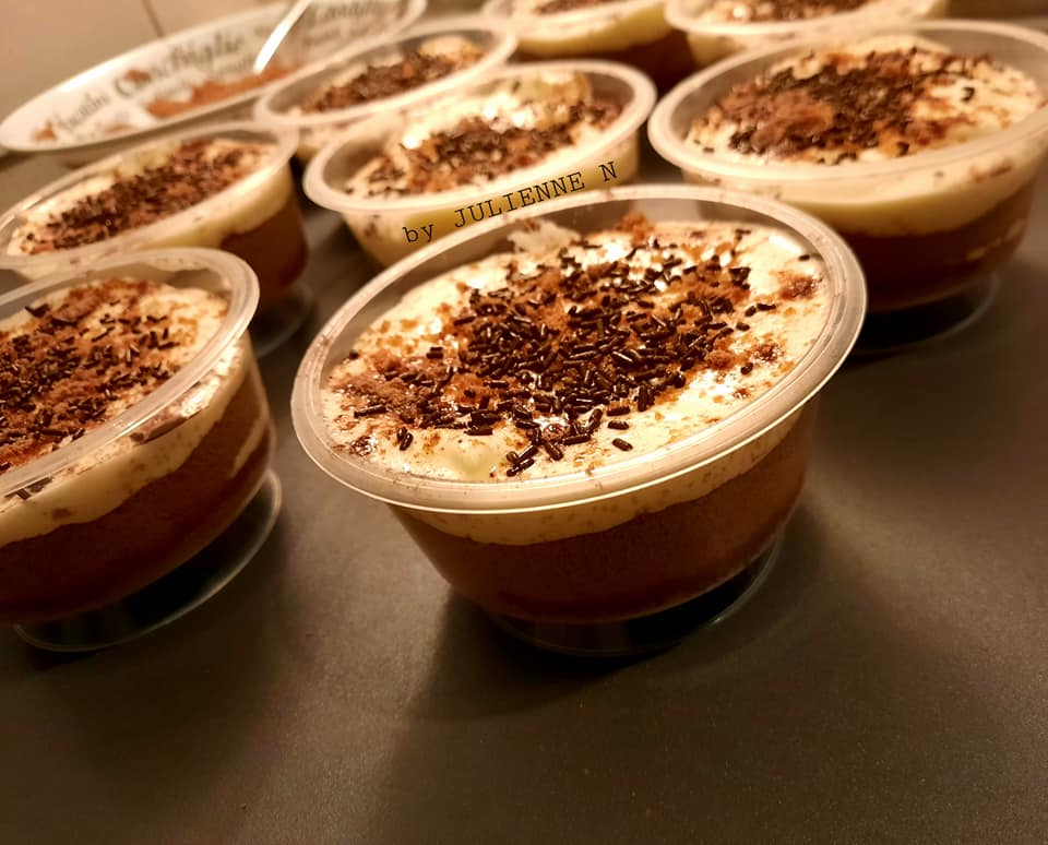Ces coupelles de tiramisu sont faites avec les chutes des génoises des numbers cakes à la poudre chocolatée sucrée.