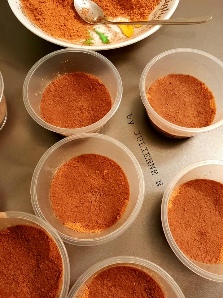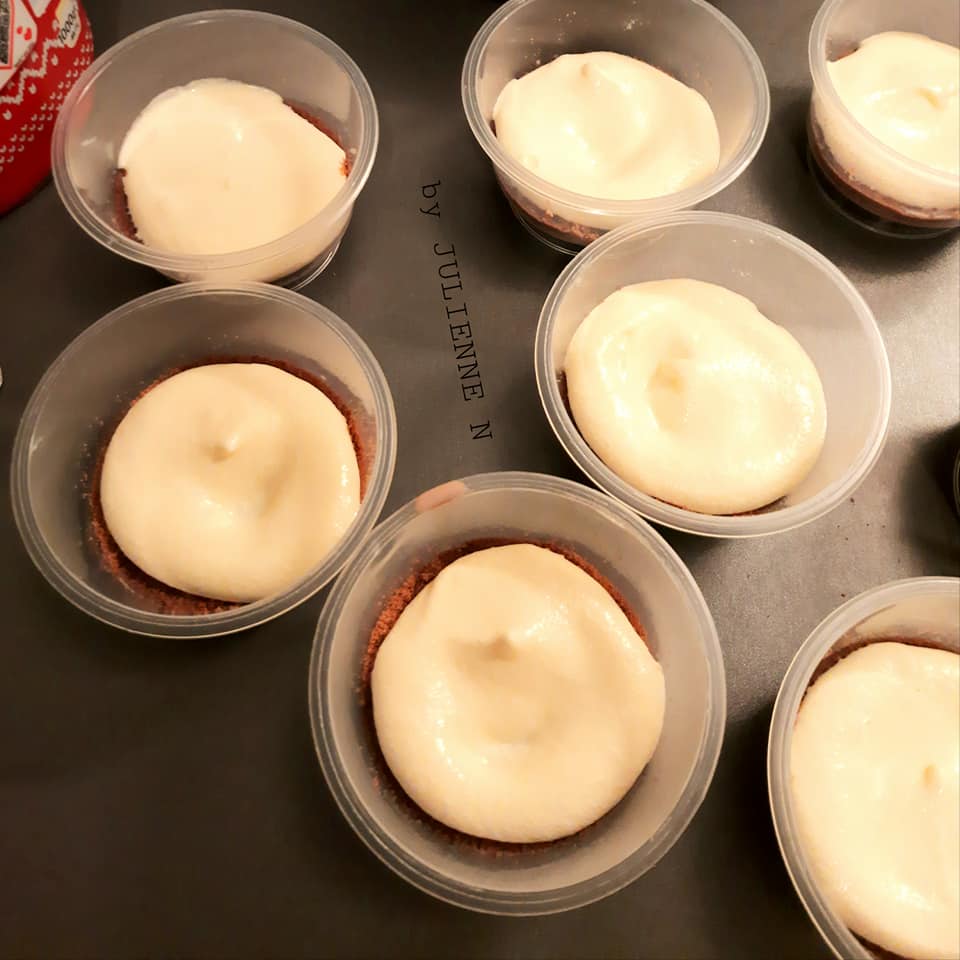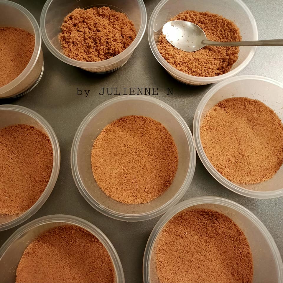 - Remplir le fond de chaque coupelle avec une cuillère à soupe de génoise en poudre. Tasser avec le dos d’une cuillère à café. Mouiller avec une cuillère à soupe de lait chocolaté de Nesquik, froid.