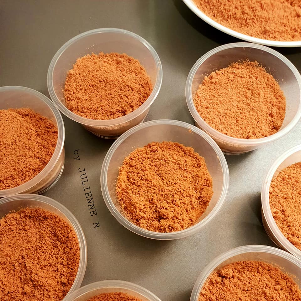 - Laisser sécher les jutes des génoises à température ambiante sur une grille et hors de l’humidité. Les réduire en poudre et mouiller la poudre avec le jus d’une clémentine et ½ cuillère à café d’eau de fleur d’oranger, puis réserver.