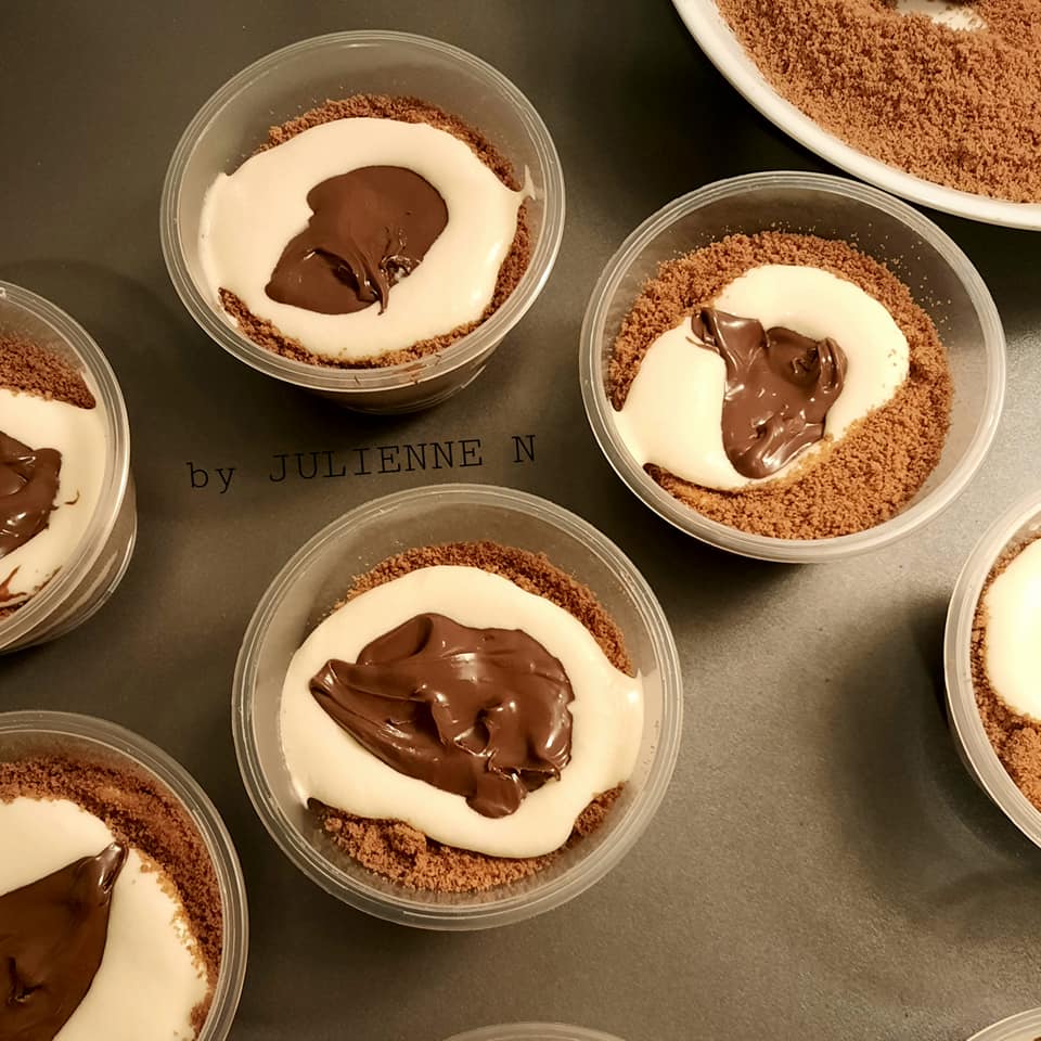 - Ensuite y la petite cuillère à café de Nutella et fermer avec une cuillère à soupe de mascarpone, dans chaque coupelle. Saupoudrer d’un peu de génoise, de poudre Nesquik et un peu de vermicelle de chocolat. Laisser au réfrigérateur au minimum 3h00. Servir bien froid.