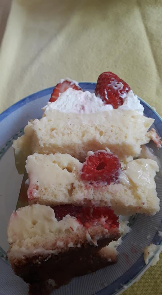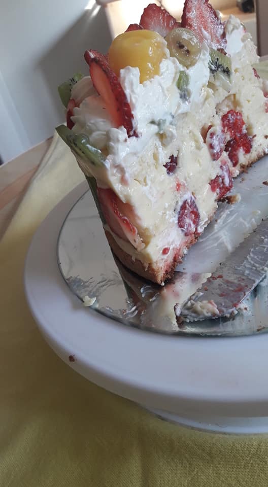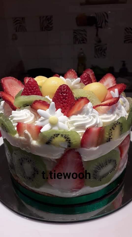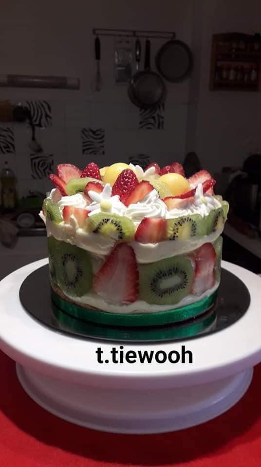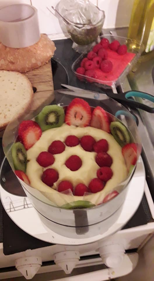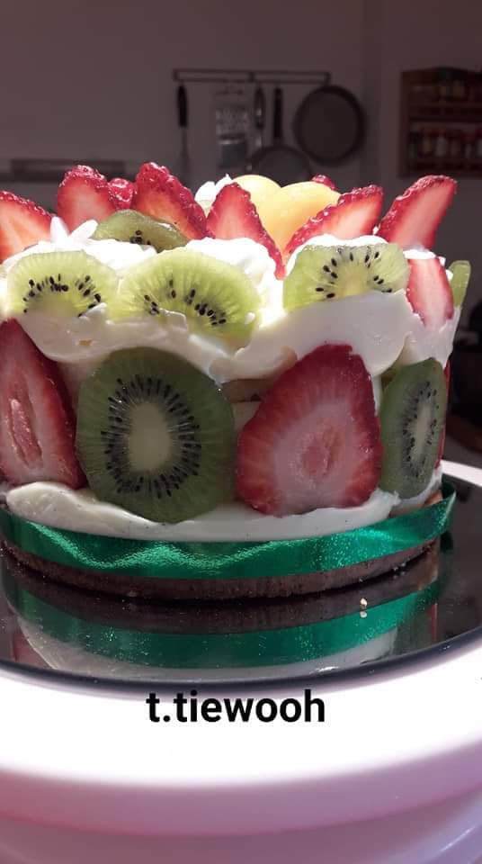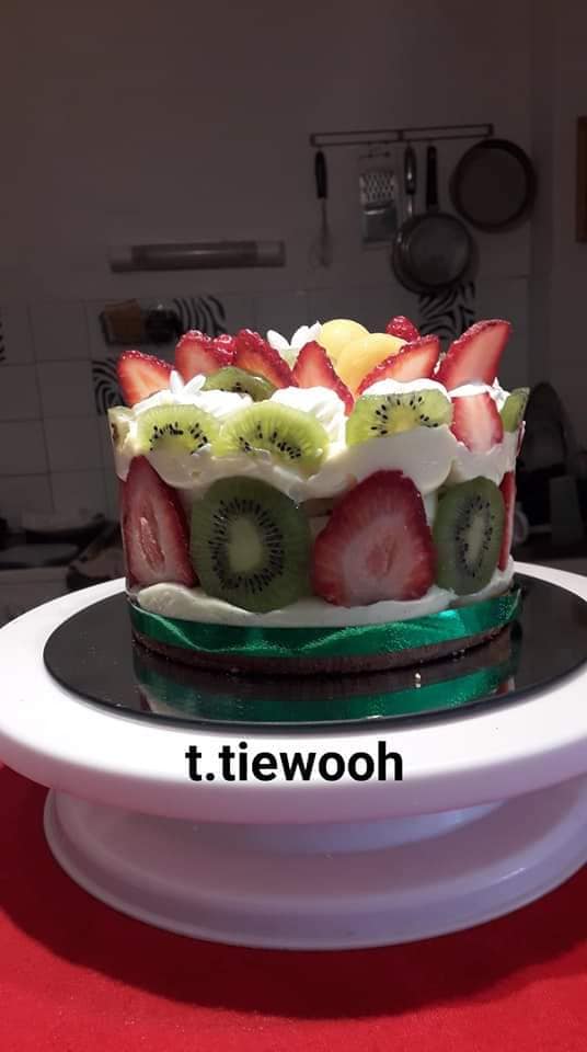 - Coller les fruits sur les parois internes du moule, déposer une couche de moelleux au fond, lettre la crème, y déposer quelques morceaux de fruits, remettre une autre couche de moelleux, renouveler l’opération pour les trois couches, finir par la crème. Mettre au réfrigérateur pour 6h de temps au moins,après décorer a votre guise