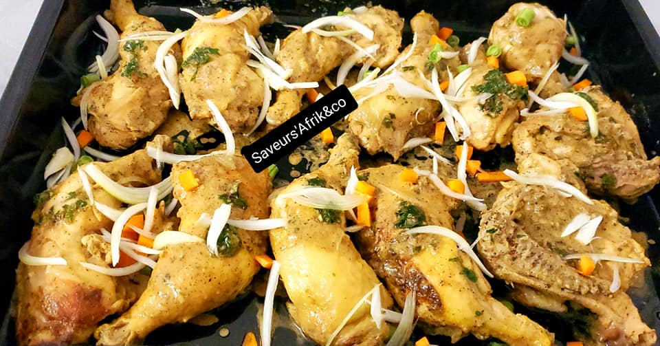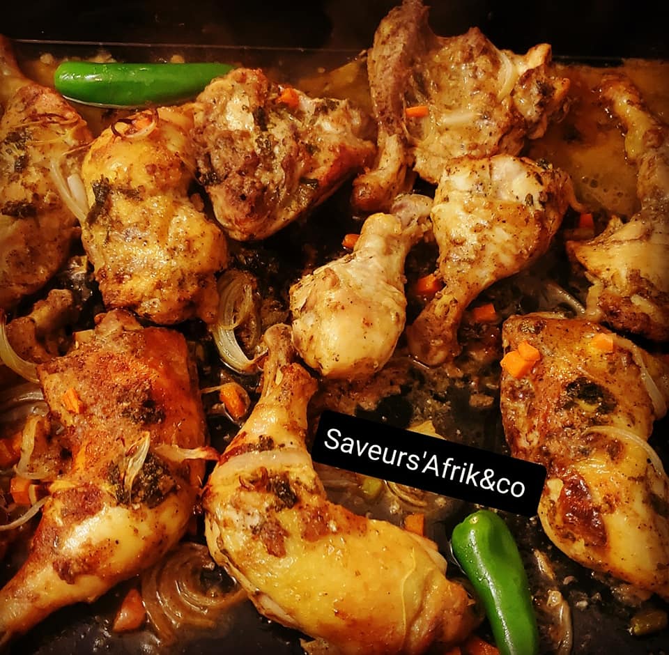- Laver avec du citron les cuisses de poulet.Mariner avec une partie de la marinade de votre choix avec ajout de moutarde (mais j’ai utilisé ici le nokoss) et laisser reposer au réfrigérateur pendant environ 1h, voire plus si possible.