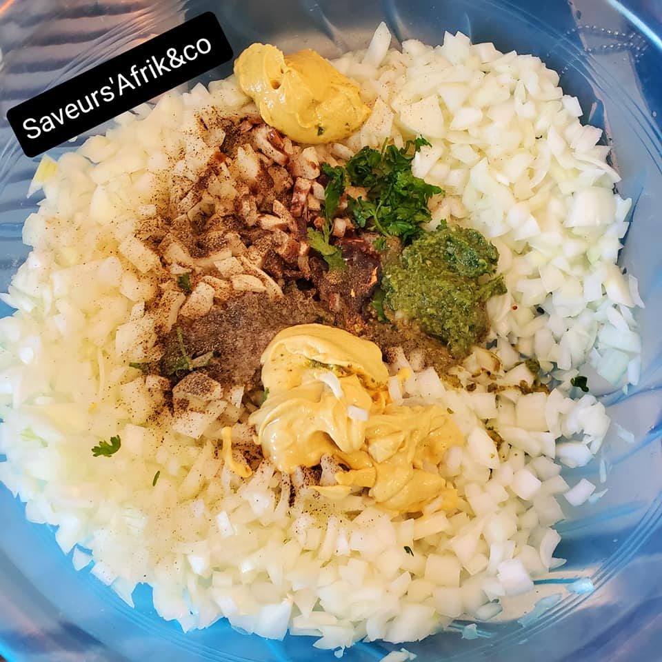 - Laver et découper les oignons en dés, ajouter l’autre moitié de la marinade, du jus de citron, du vinaigre balsamique, poivre, moutarde douce, ail haché, sel et 1 cuillère à soupe de marinade. Laisser reposer 10min.