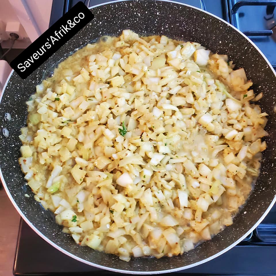 - Ensuite, poser votre casserole au feu et ajoutez y un filet d’huile, puis faites revenir du yet, ajouter le mélange oignons et faites les frire à feu moyen. Ajouter le bouillon de poulet, feuilles de laurier, le piment frais et rectifier l’assaisonnement. Laissez mijoter 15 min à feu doux. C’est prêt