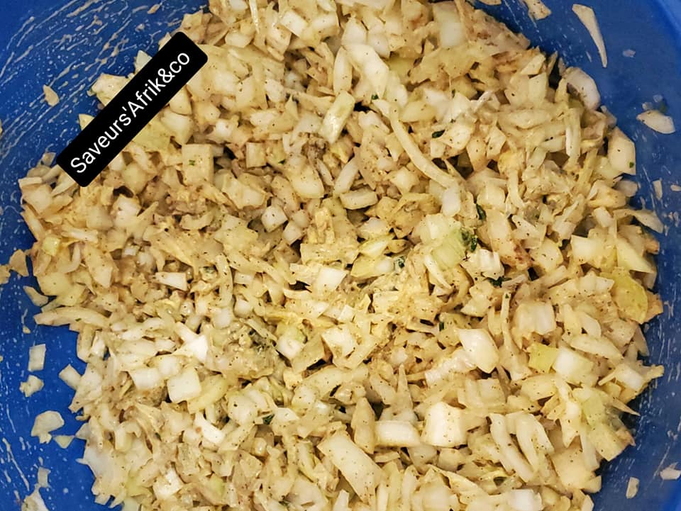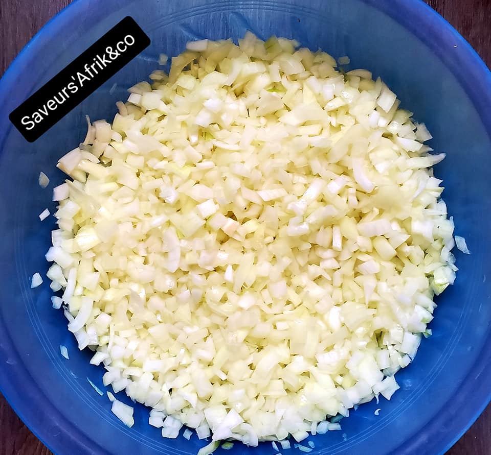 - Préparation de la marinade nokoss Hacher ou piler au mortier 1 oignon, 5 gousses d’ail, ciboulette, un tout petit morceau de gingembre, 1 piment sec, 1 poivron, poivre, sel puis réserver.