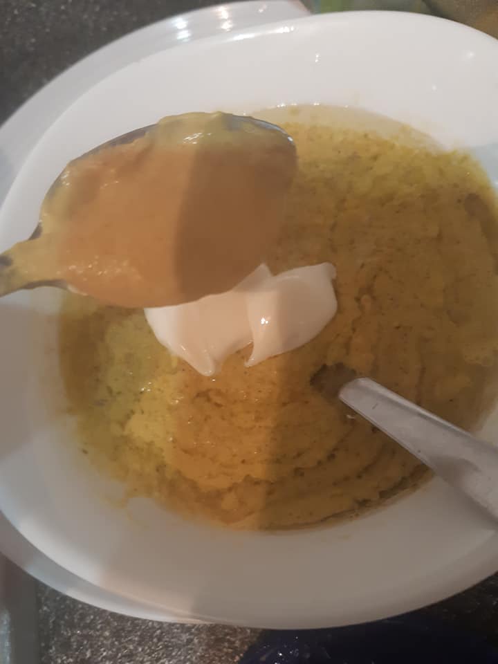 - Ajouter huile, la moutarde et mayonnaise, et enfin le sel
