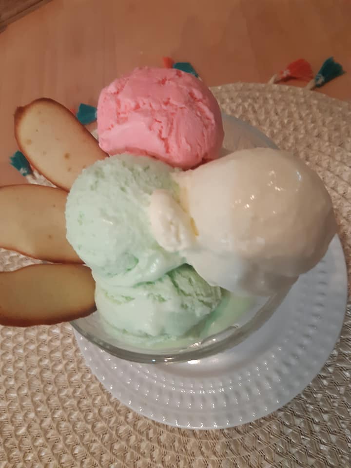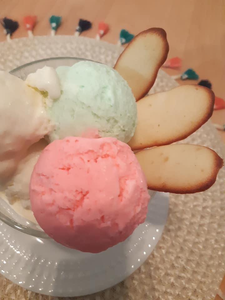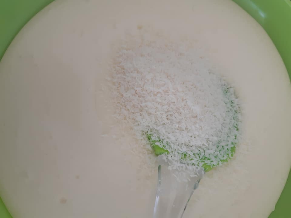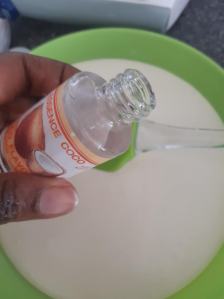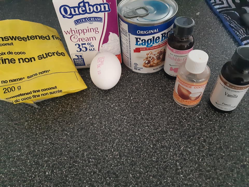 - Pour la glace a la noix de coco, mettre arome et coco râpé mélanger et ajouter une cuillère à soupe de blanc d d’œuf monté en neige, remuer délicatement sans totalement casser le blanc d œuf