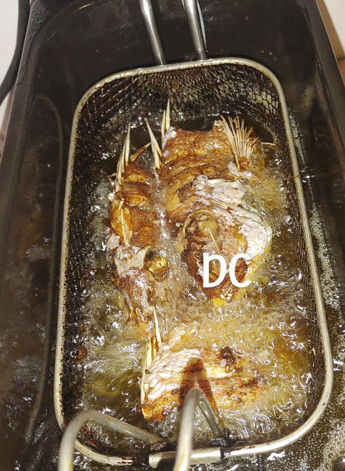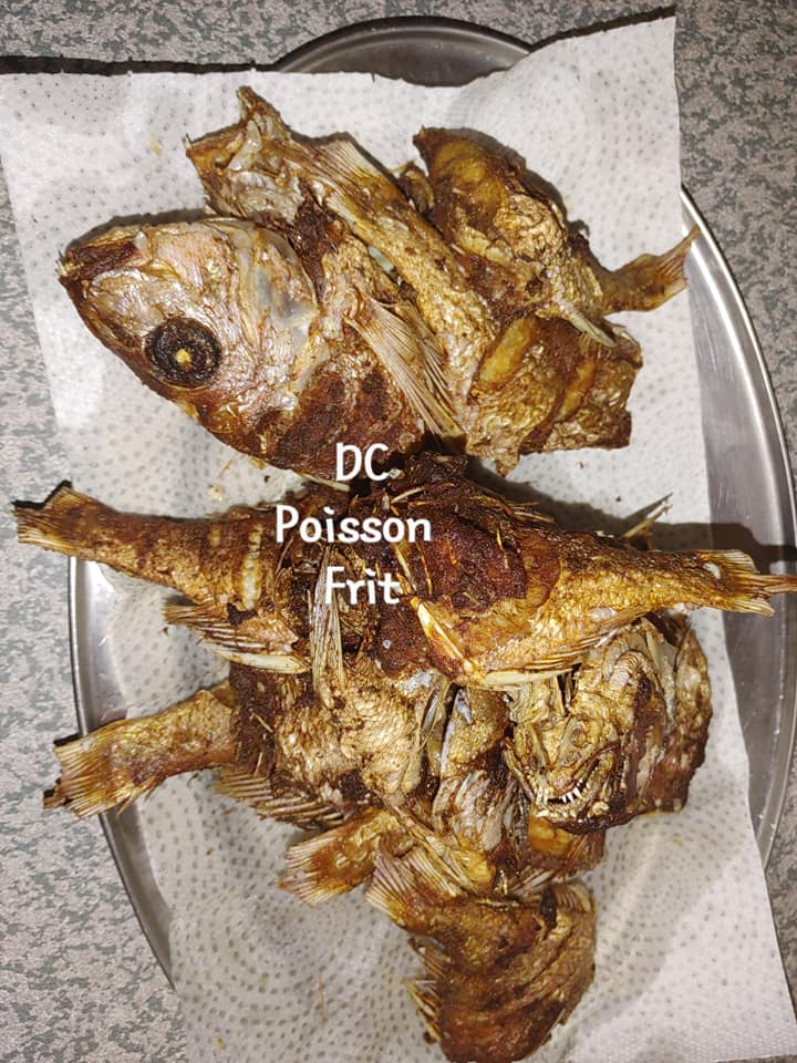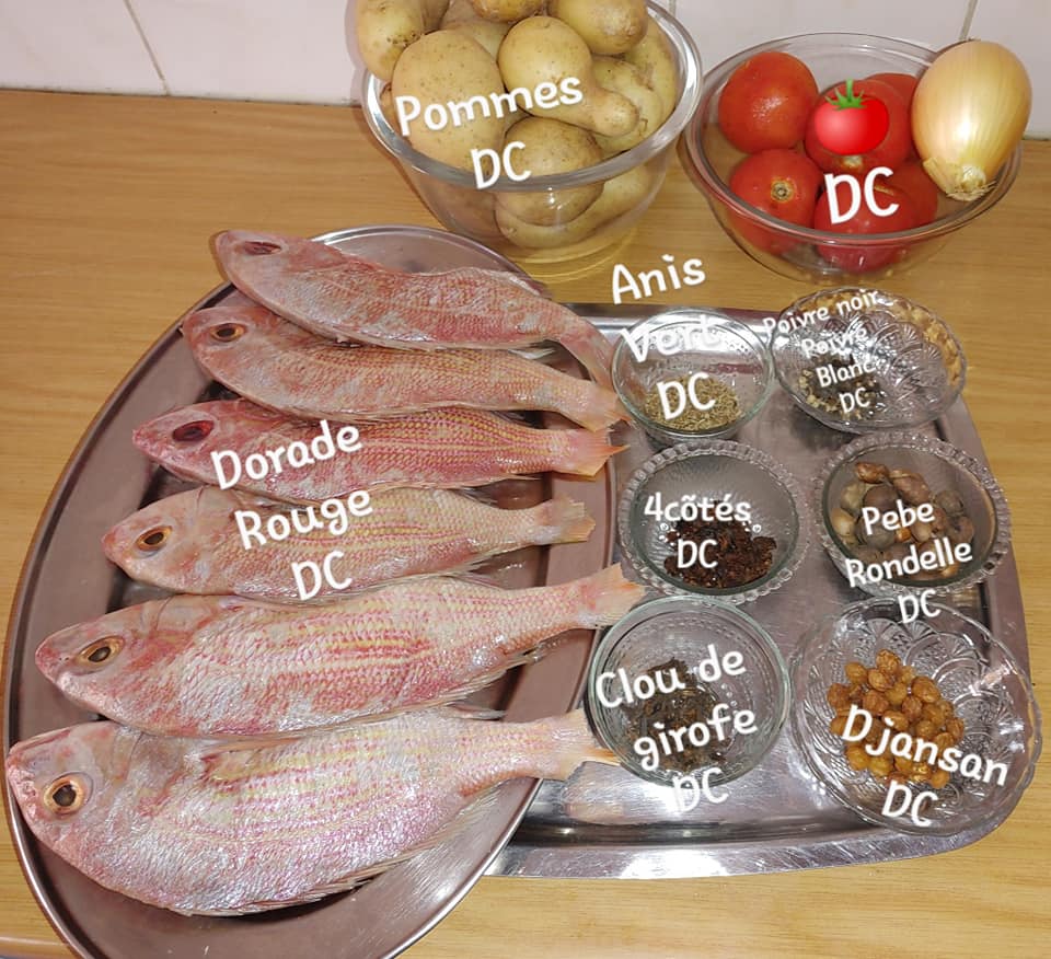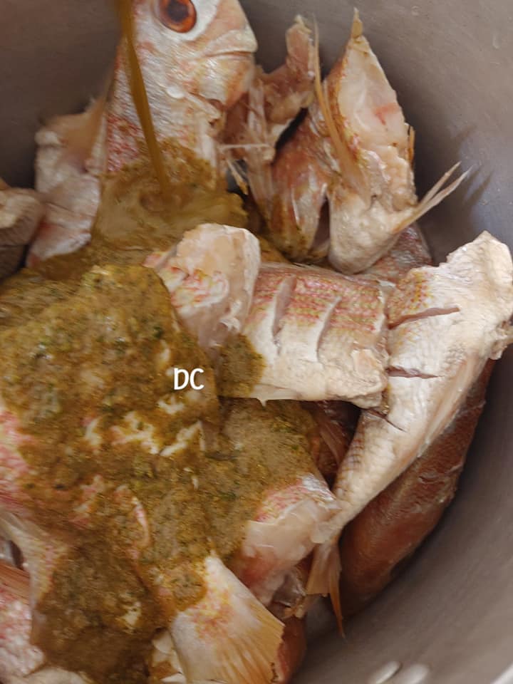 - Ensuite assaisonnez votre poisson avec vos épices qui ont été bien écrasés ( condiments verts, anis vert,poivre noir et blanc, ronde et pebe) réservez une autre parties pour votre bouillon de pommes.