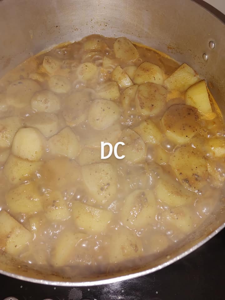- Epluchez et lavez vos pommes à plusieurs eaux, placez votre marmite au feu avec vos pommes à l’intérieur avec un litre d’eau ..lavez vos tomates et djansag , les ajoutez dans vos réserves d condiments et écraser. Et verser dans votre marmites d pommes qui boue au feux laisser cuire pour 1h 30 ou plus ajouter une cuillère d’huile . Ne laissez pas sécher puisque c’est le bouillon de pommes