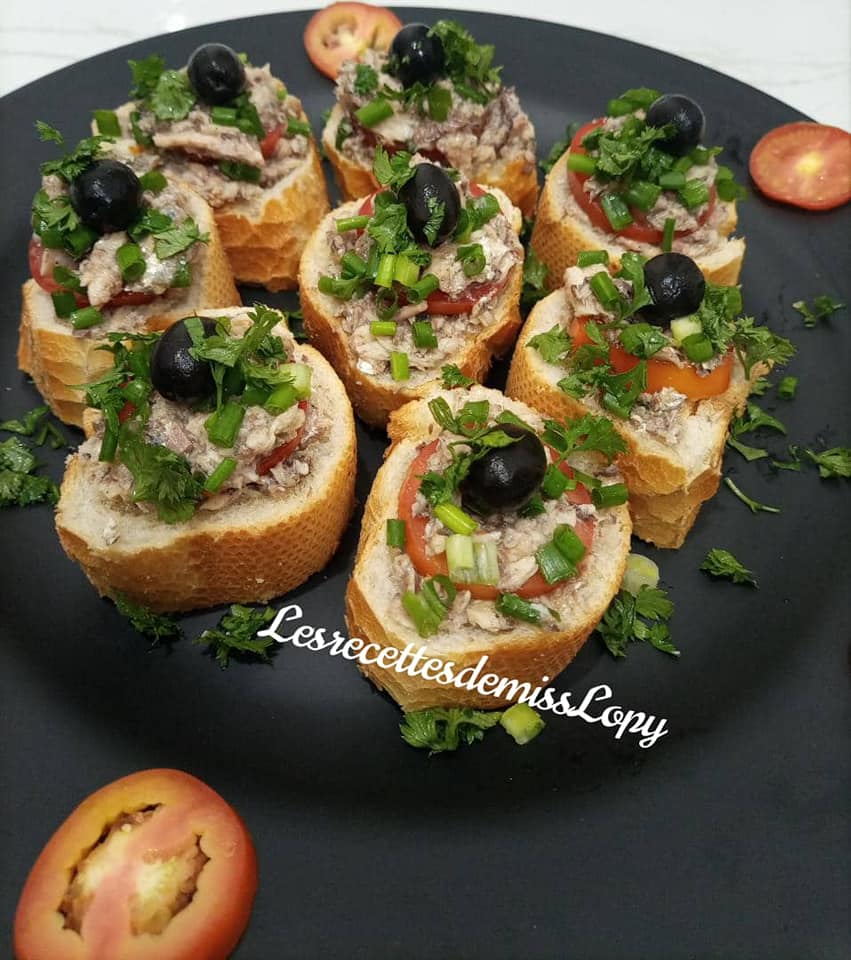 4. Assemblage : Alternez la purée de sardines et les tranches de tomates sur le pain et ensuite versez en pluie le persil et la ciboulette et enfin mettre les olives au sommet.