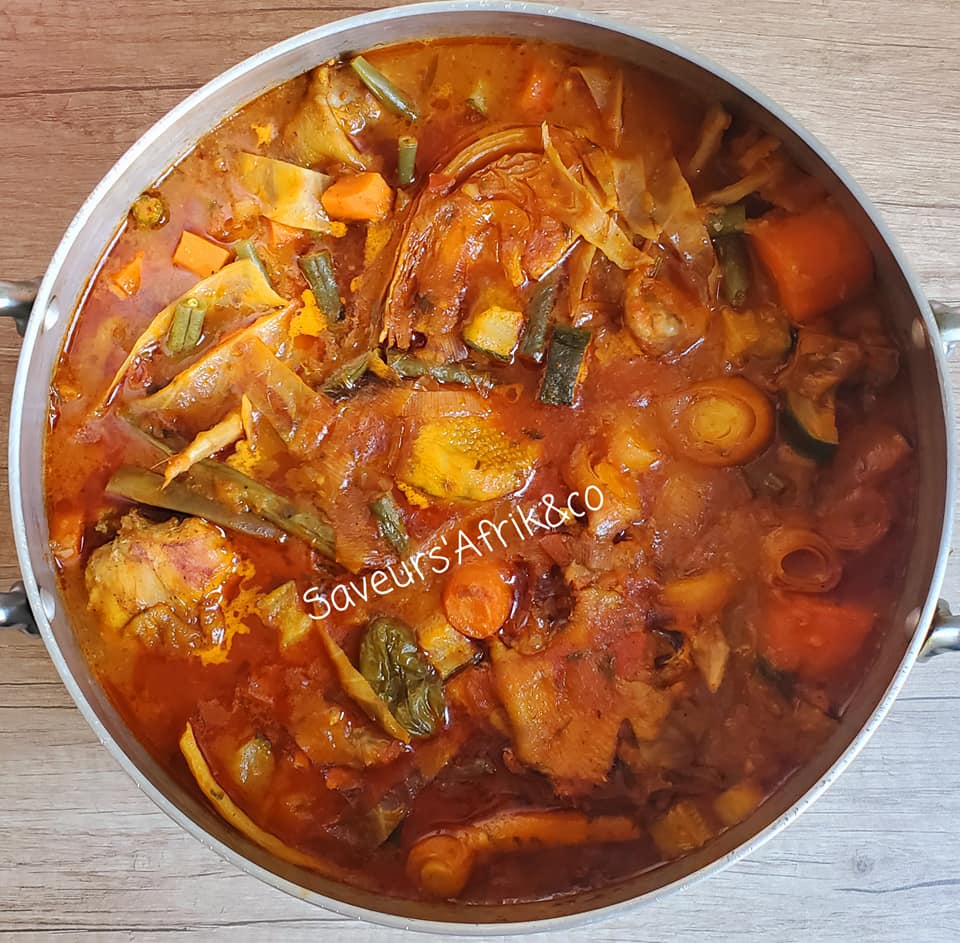 - Puis, ajouter les légumes préalablement nettoyés et découpés à votre guise (chou, haricots verts, poireau carottes etc), ajouter l’eau de cuisson et laisser cuire pendant 15 min.