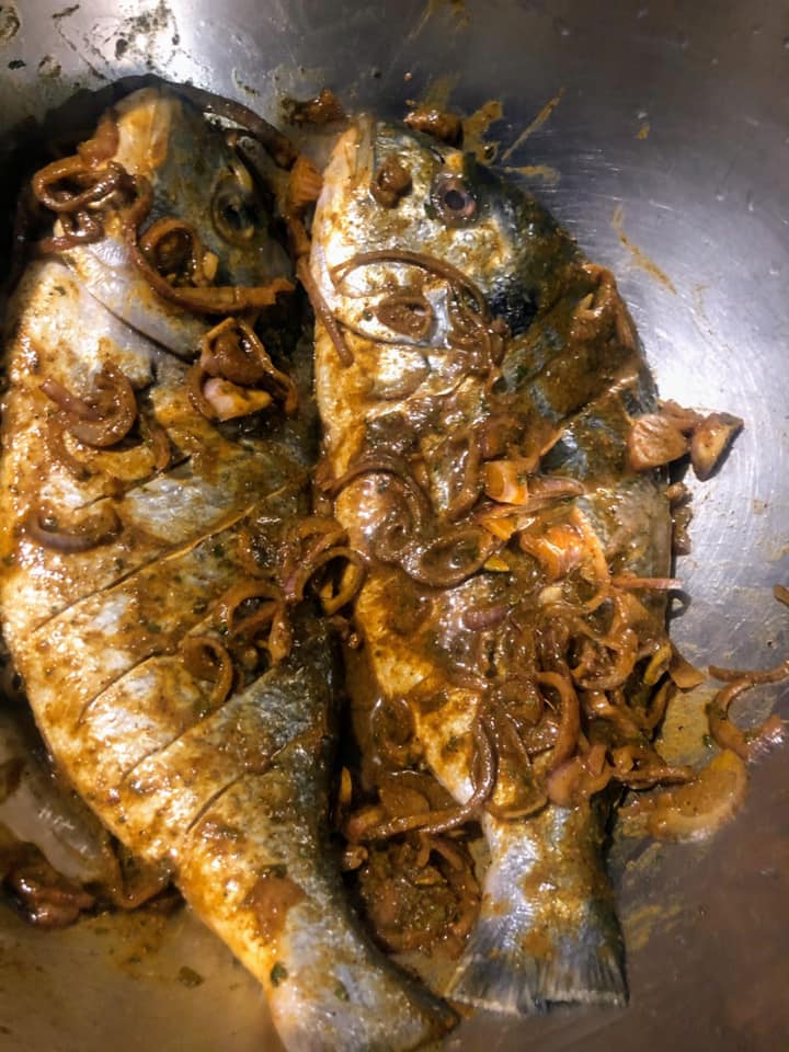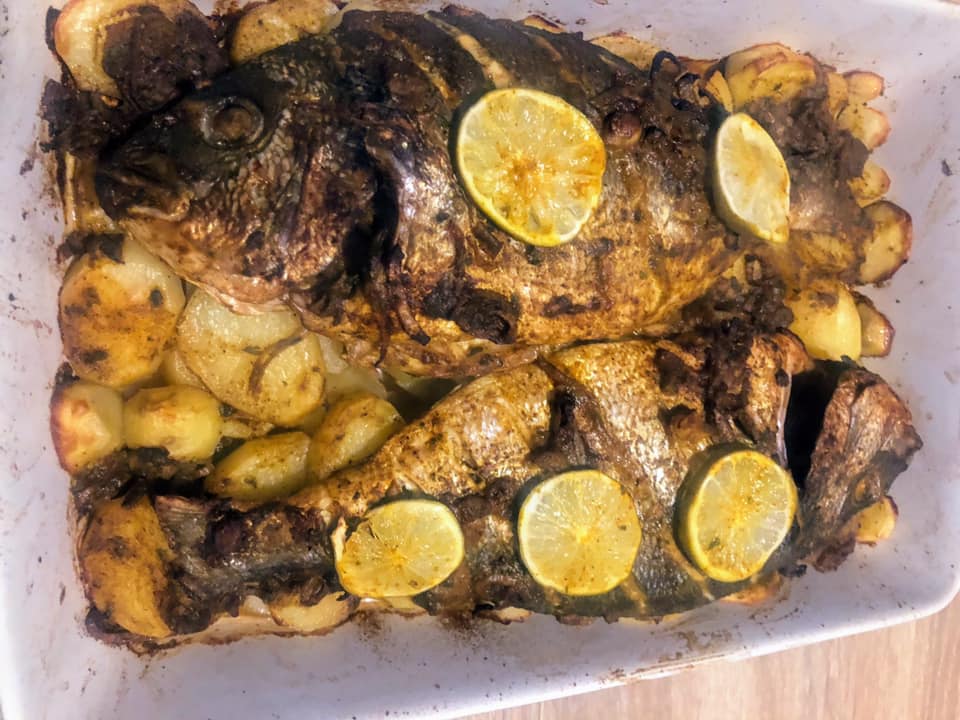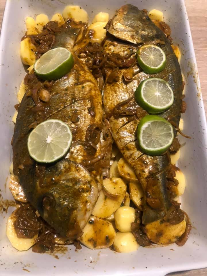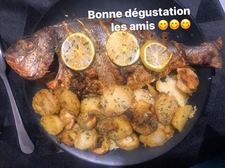 Déposez les daurades dessus et ajoutez quelque lamelle de citron j’en es aussi mis à l’intérieur du poisson recouvrez de papier aluminium et enfourner à 180 degrés pendant 30 mns la cuisson dépend du poids de vos daurades les miennes font 800g pièces
