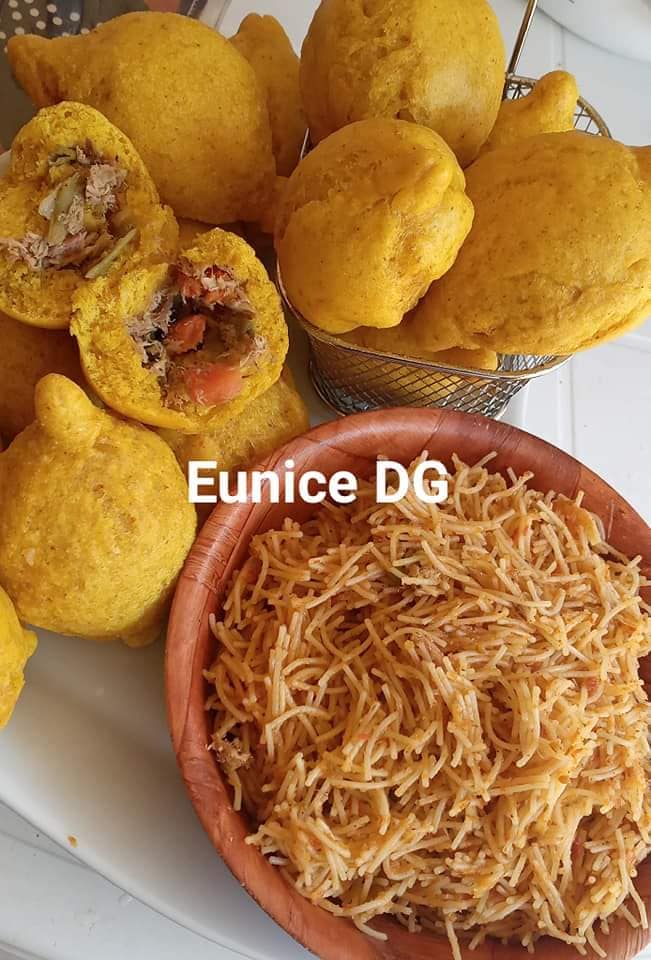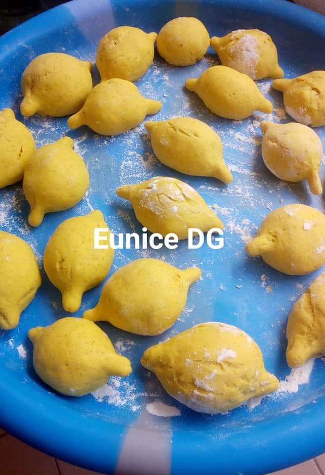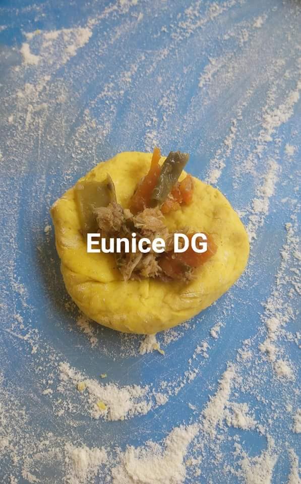 - Après ce laps de temps, dégazez la pâte, mettre sur une table farinée, faites de petits pâtons, aplatir légèrement, mettez la farce au milieu, refermée en pinçant avec vos doigts, roulez avec votre paume, étirez le bout, couvrir avec une serviette propre pendant 30mn le temps de monter un peu et frire.