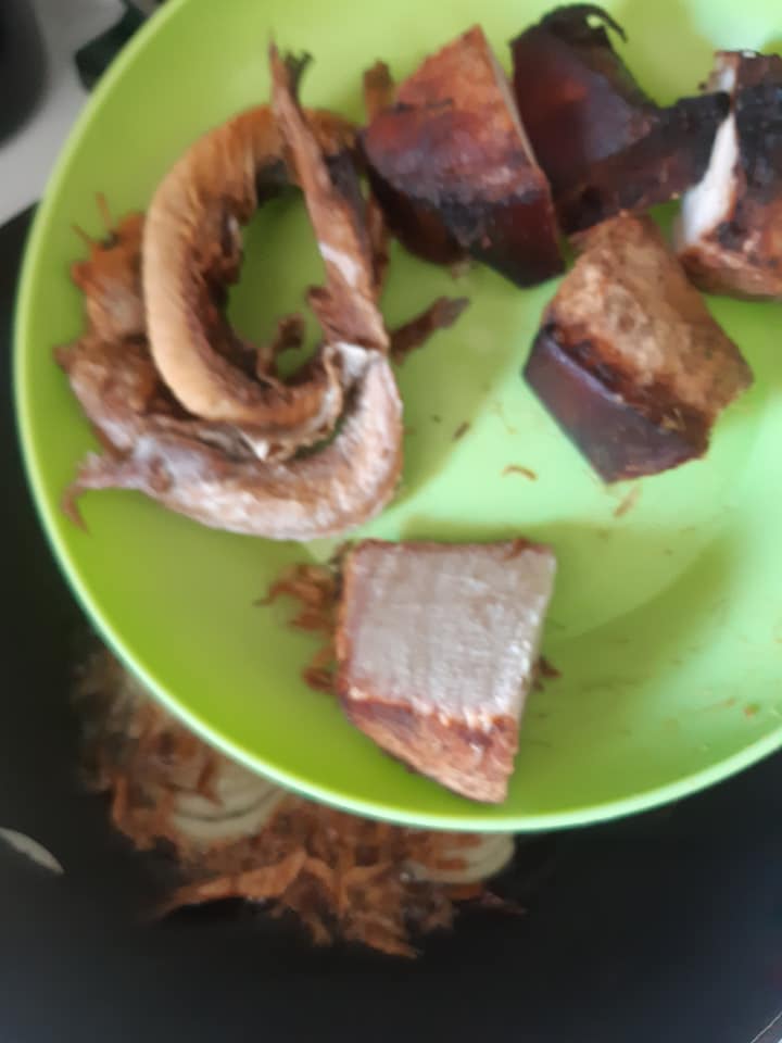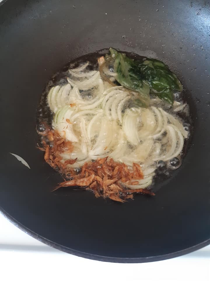 - Mettre l huile dans une casserole et ajouter la moitié d oignon, le basilic les crevettes bien brasser et 5 min après ajouter morue et puis ajouter les condiments écrasés