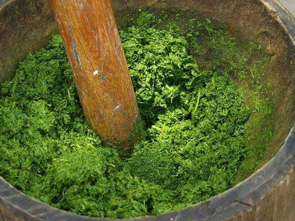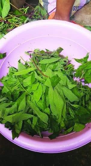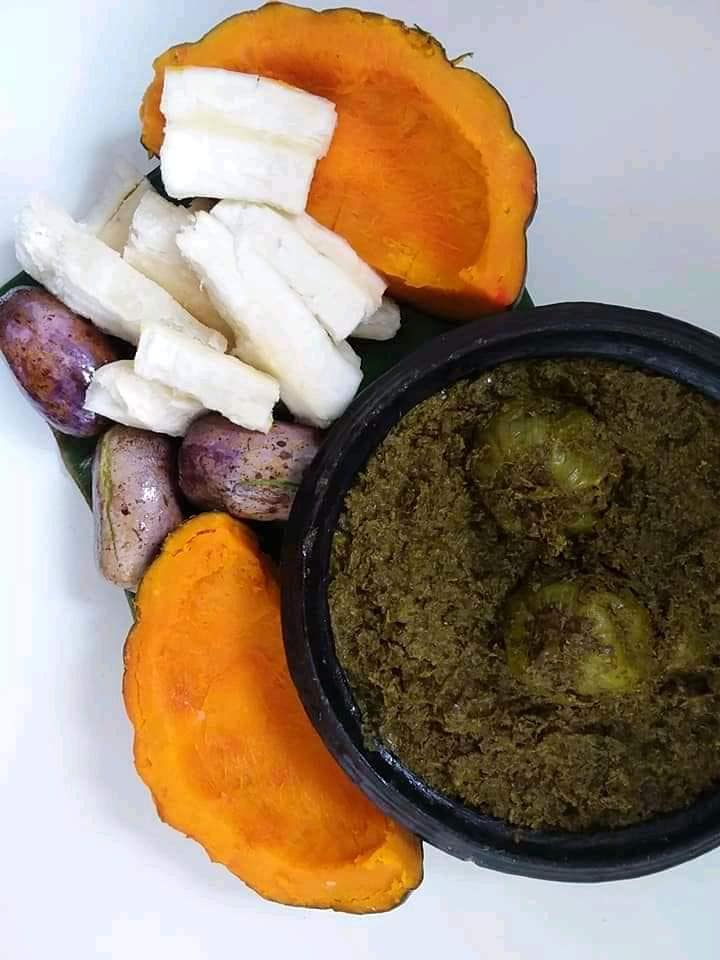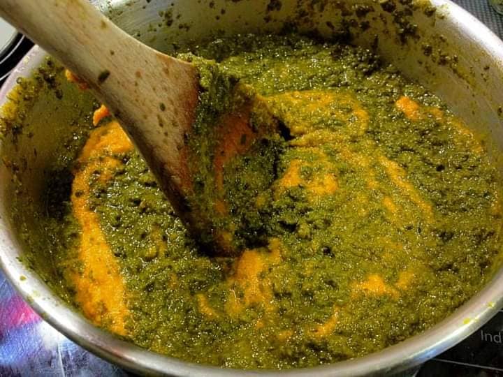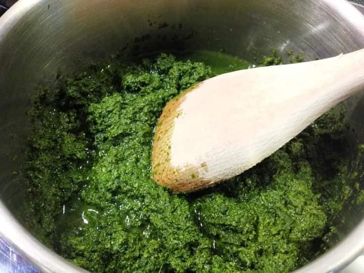 - Piler les feuilles de manioc et les mettre dans une grande casserole avec de l’eau;