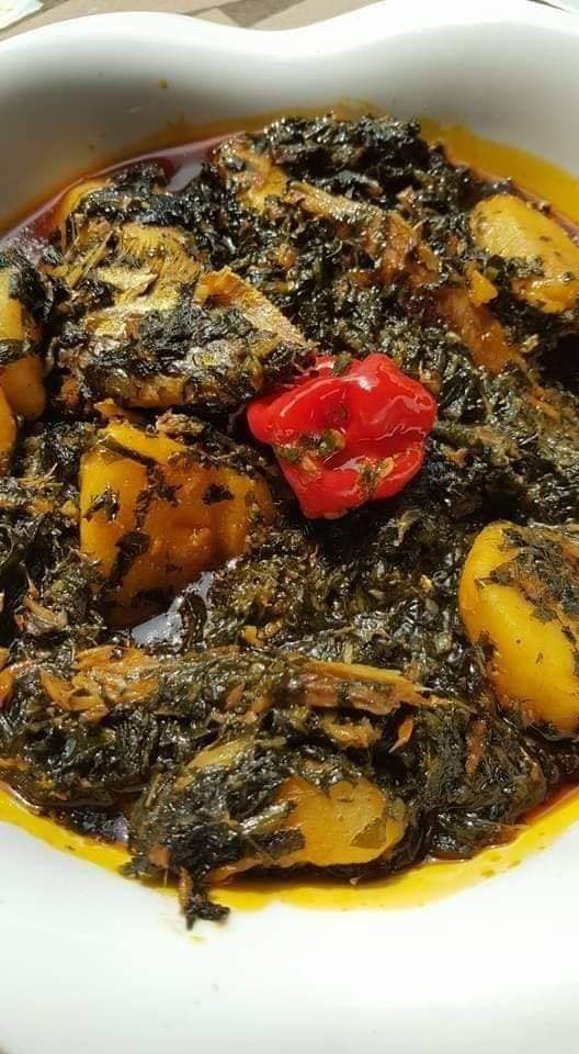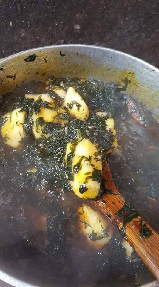 - Mettre le macabo dans une casserole, ajoutez les condiments écrasés, bougas, les écrevisses, l’oignon découpés, l’huile rouge, ajoutez le ndolè, le sel, cube et verser de l’eau, placez au feu.
