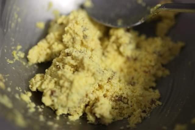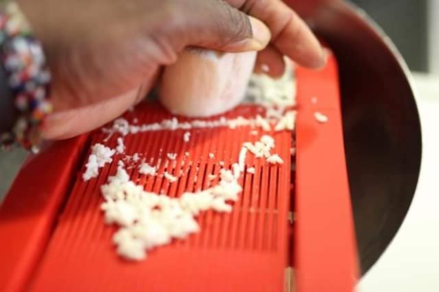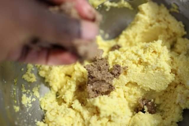 - Émiettez ensuite votre pâte d’arachide dans le mélange de manioc.