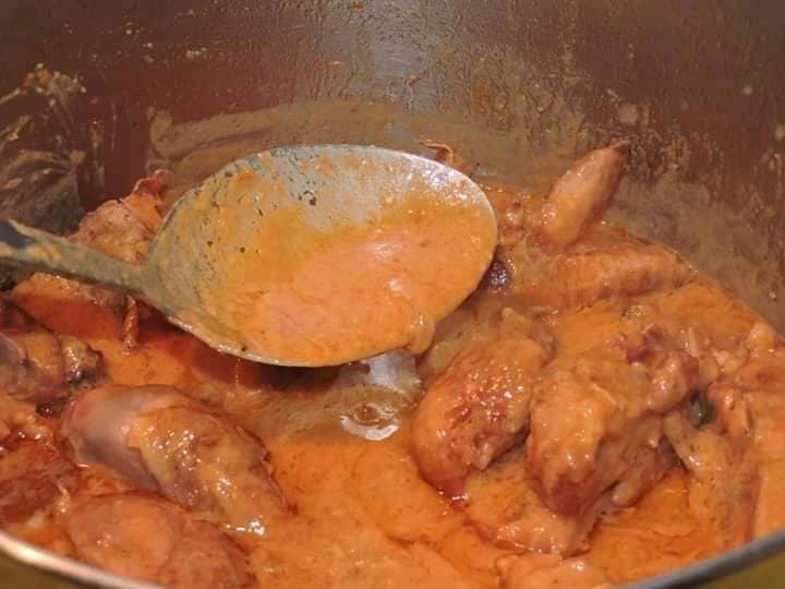- Ajouter le poulet et laisser mijoter un quart d’heure, puis mettre une cuillère à soupe d’arachide dans la sauce et remuer délicatement jusqu’à ce que cela soit parfaitement délayé. Assaisonner selon votre goût.