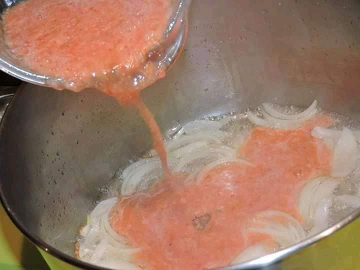 - Ajouter la tomate écrasée avec les condiments écrasé aussi et faire cuire un peu. Avant que cela n’attache ajouter un peu d’eau et faire réduire jusqu’à cuisson complète de la sauce et laissee cuire.