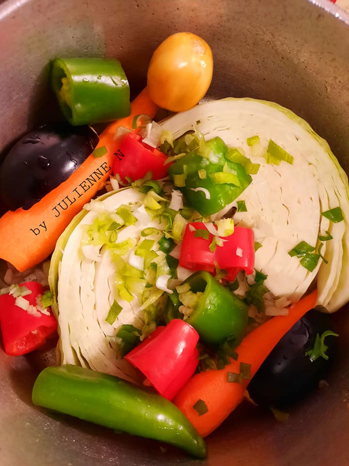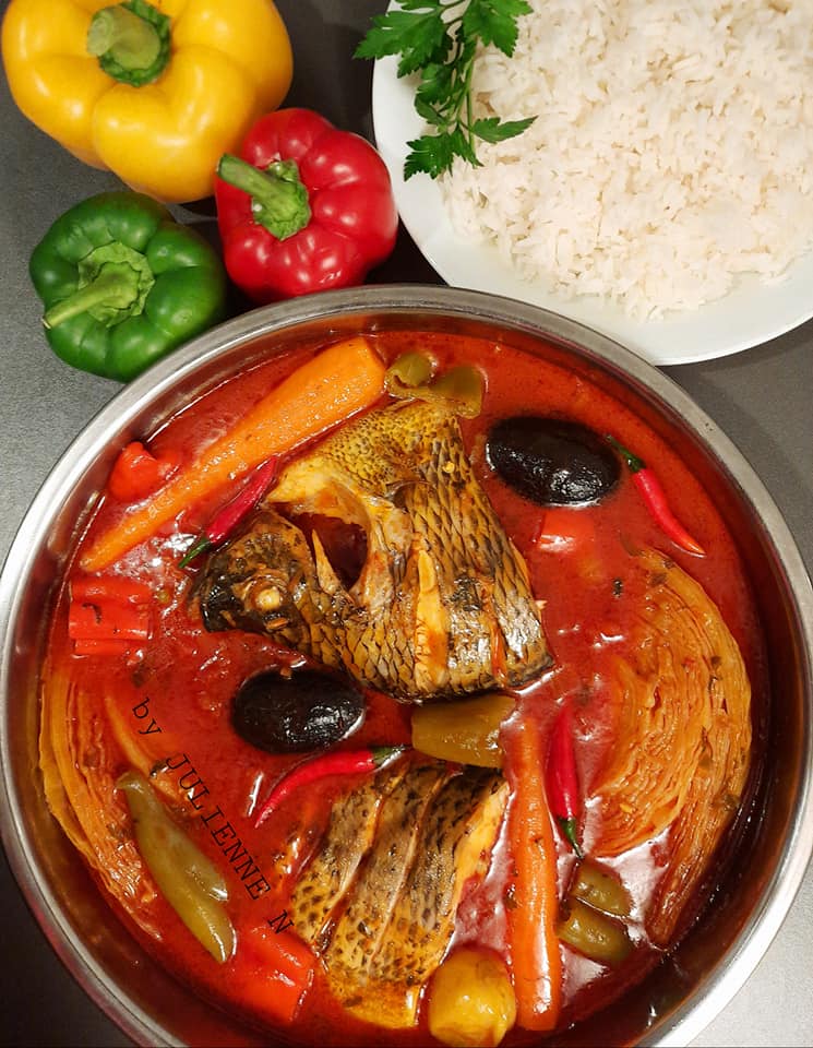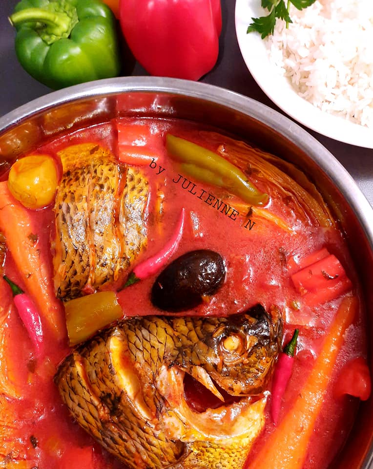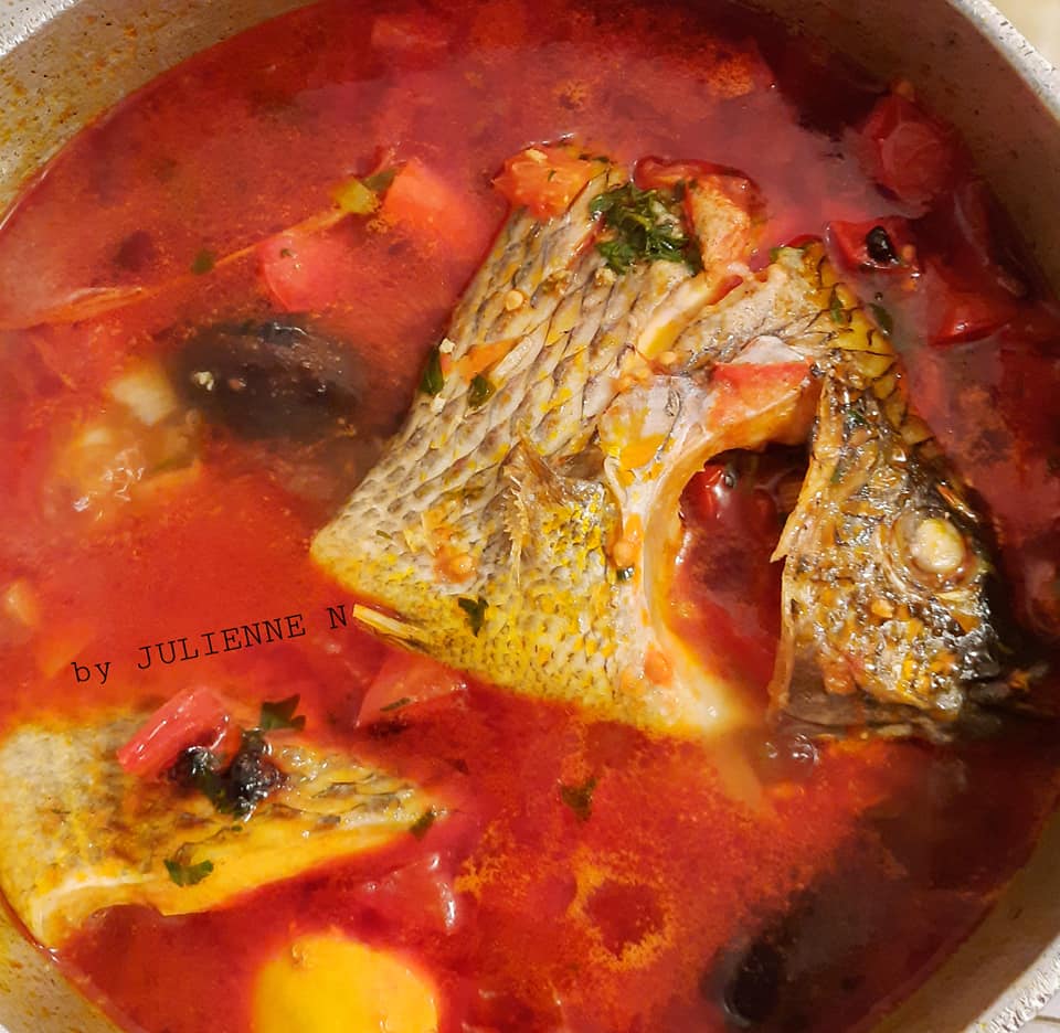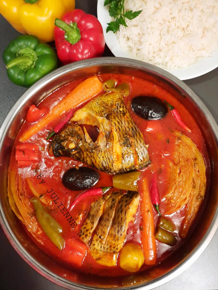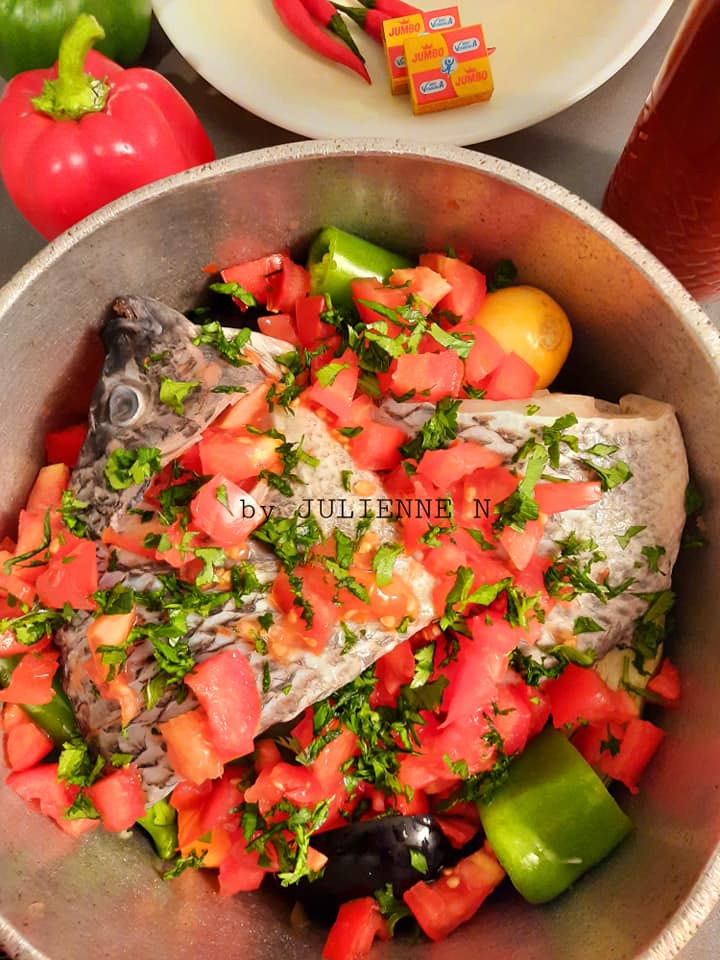 - Les mettre dans un fait-tout par ordre de difficulté de cuisson et poser les morceaux de poisson par dessus. Y ajouter les fines herbes, l’eau, les cubes saveurs, le citron, le sel, le poivre et l’huile de palme.