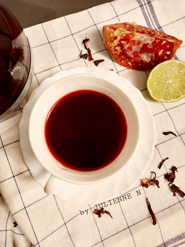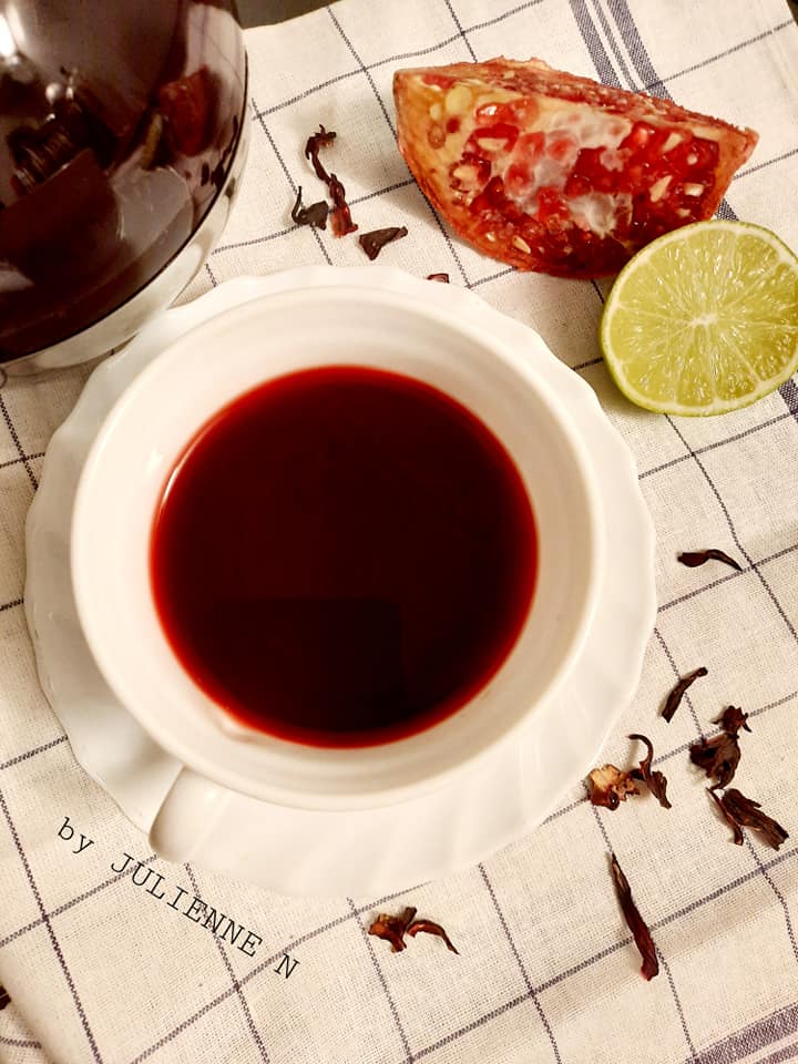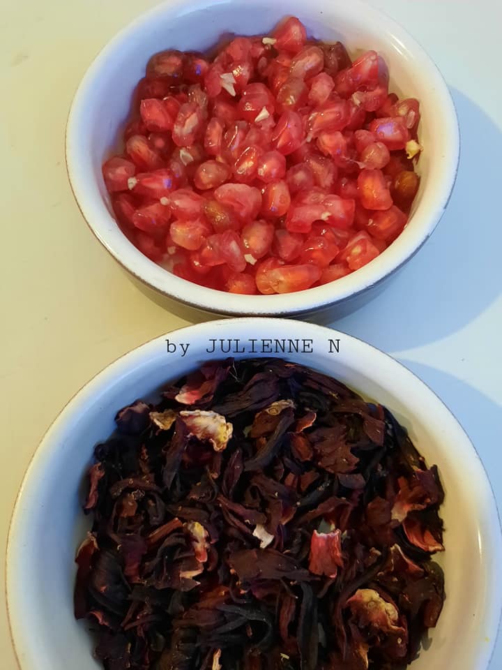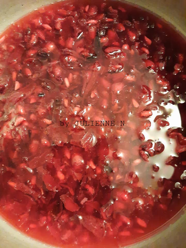 - Couper la grenade, extraire les graines et les broyer avec la main pour libérer le jus. Puis ajouter le jus ainsi que les graines dans la casserole avec les fleurs d’hibiscus.