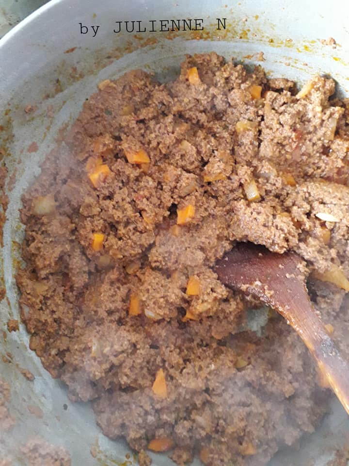 - Hacher trois oignons de la botte, l’ail et les 2 tomates concassées et faire revenir dans une cocotte avec l’huile, 5 min. Puis ajouter la viande hachée, mélanger et remuer 10 minutes sur feu moyen.