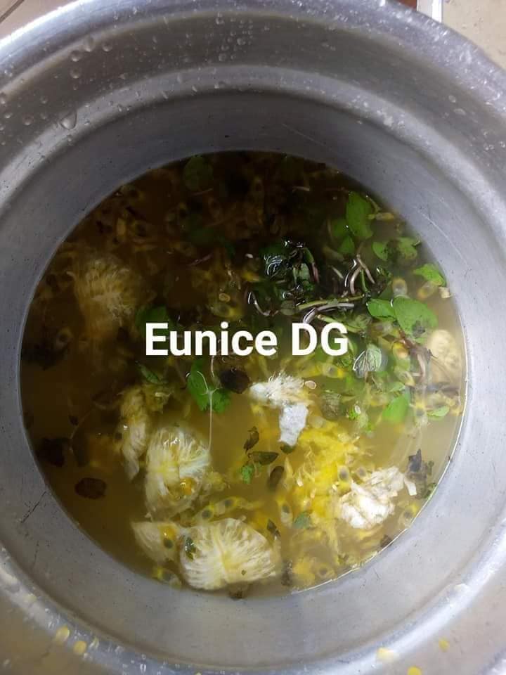 - Faites bouillir le fruit de la passion avec les feuilles de menthe, une fois que ça bien bouillir, déchargez, laissez refroidir, malaxez avec les feuilles de menthe pour faire ressortir le jus.