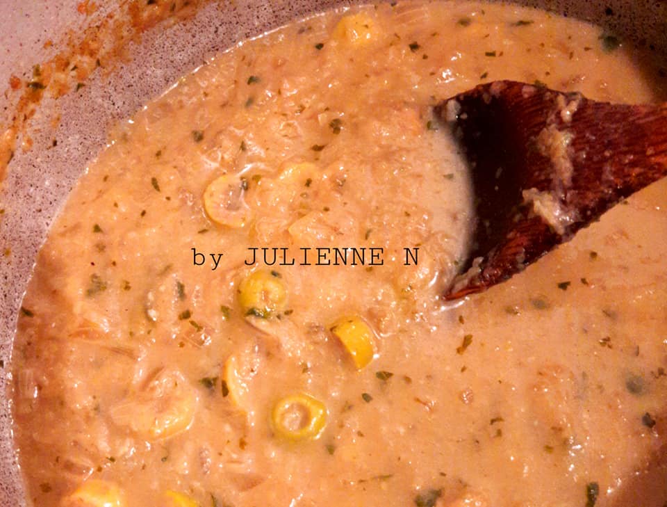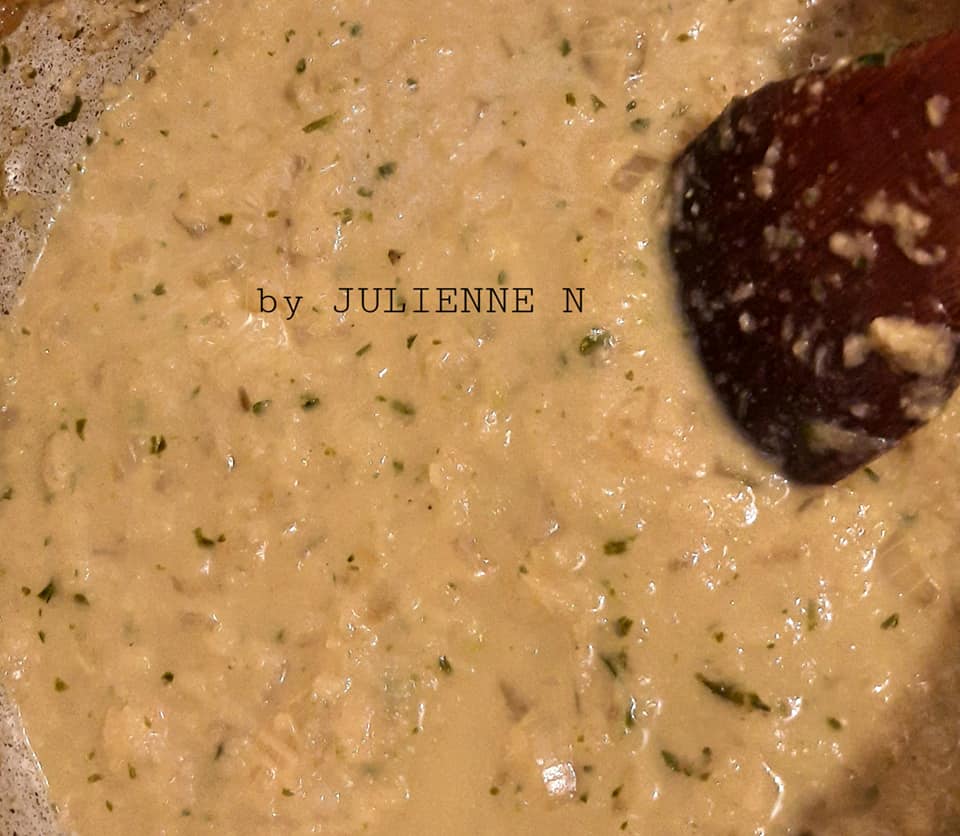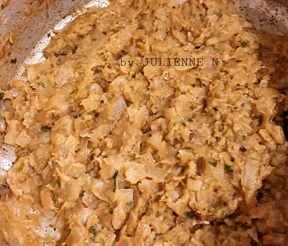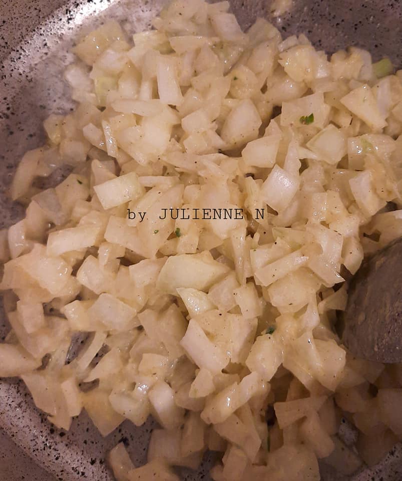 - Faire revenir l’oignon dans l’huile chaude, à feu vif, 5 minutes puis baisser le feu de moitié et ajouter le reste de la persillade et laisser cuire 10 minutes en remuant souvent.