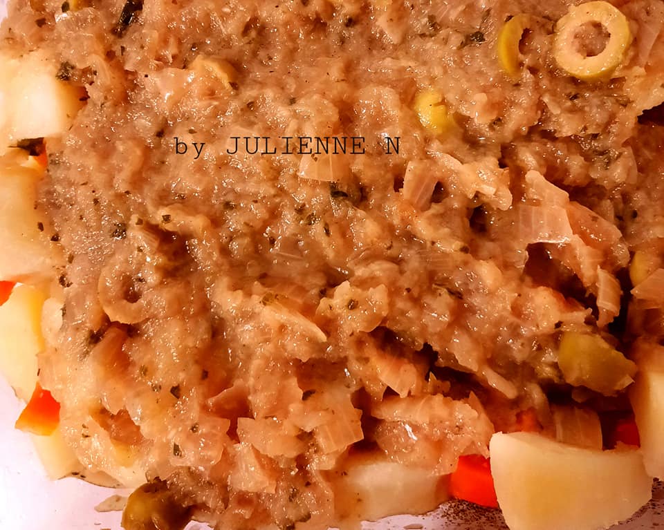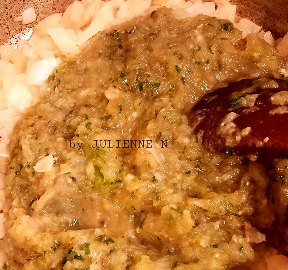 - Hacher grossièrement 2 oignons avec l’ail, le persil, la ciboulette,la coriandre, 2 cubes saveurs, 2 pincées de sel et 2 pincées de poivre.