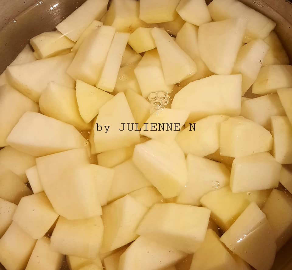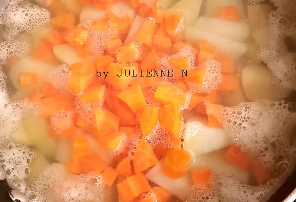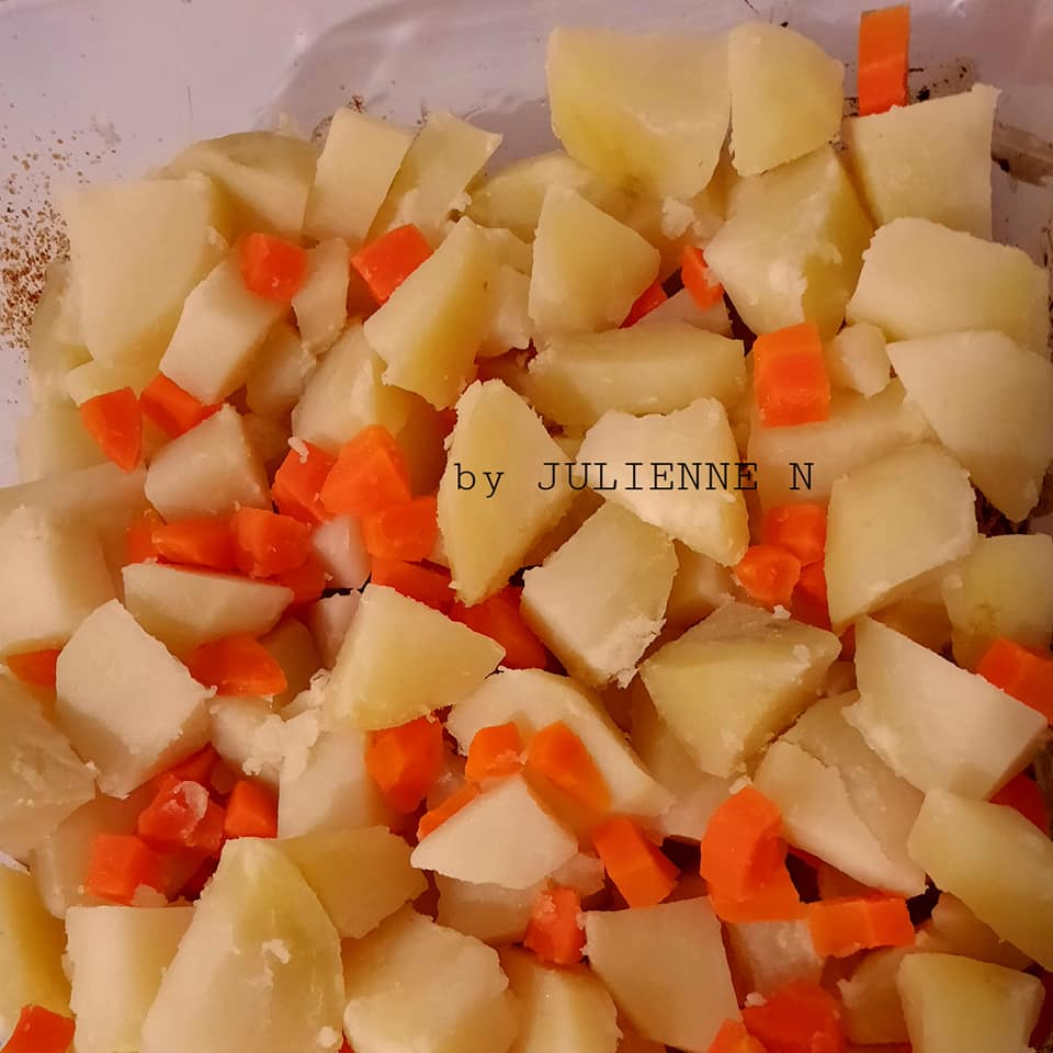 - Pendant que la viande cuit au four, on met à cuire les pommes de terre épluchées et coupées, avec la carotte coupée en dés, dans l’eau, sans sel.
