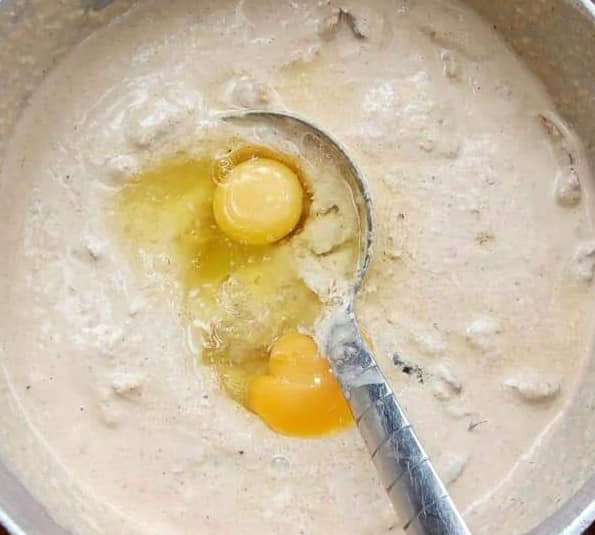 - Etape 4 : Ajoutez les œufs cassés si vous voulez moi je préfère les bouillir puis mélangez jusqu’à ce que la pâte soit homogène. Puis vérifiez l’assaisonnement.