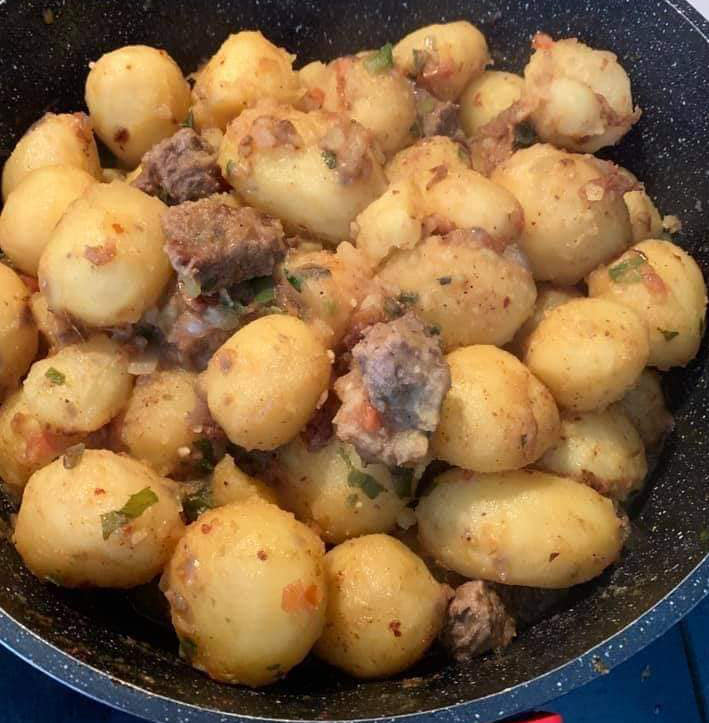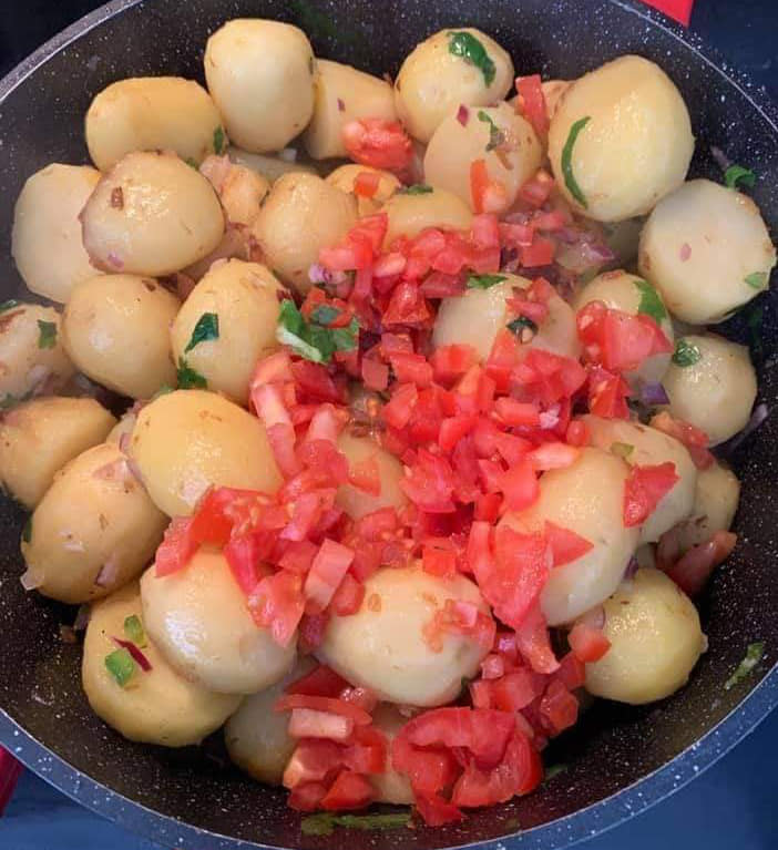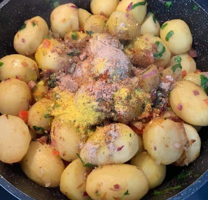 - Dans une marmite, faire revenir les pommes de terre avec du sel, les crevettes et de l’huile, une dizaine de minutes.