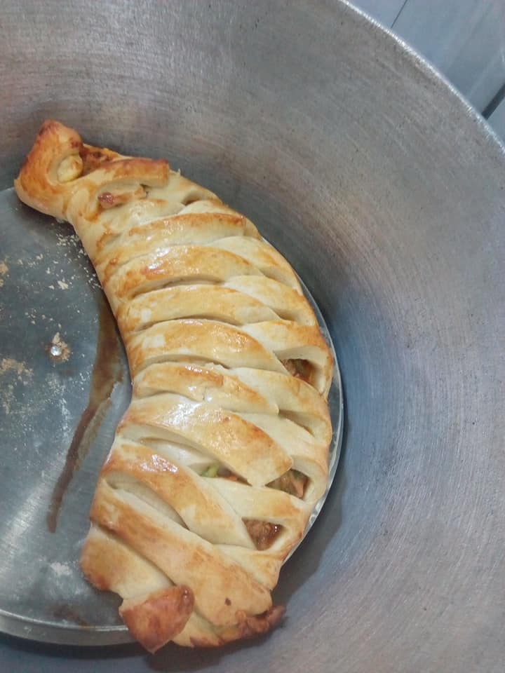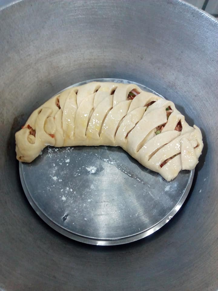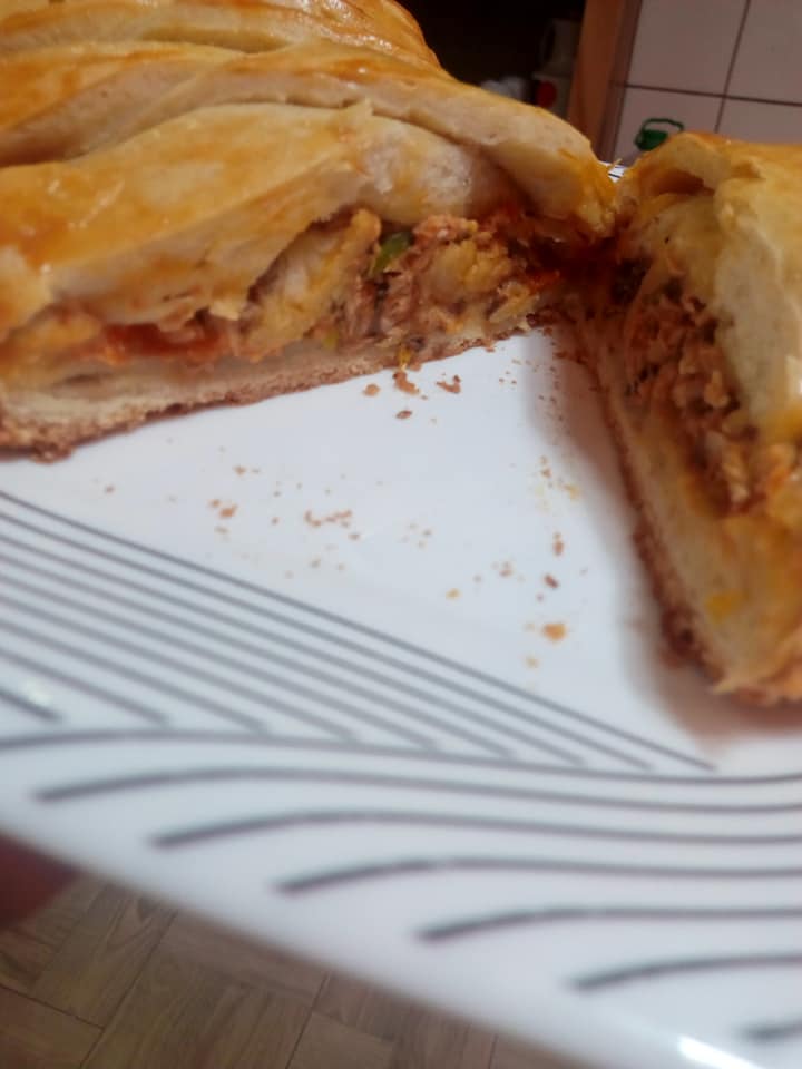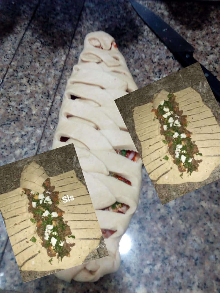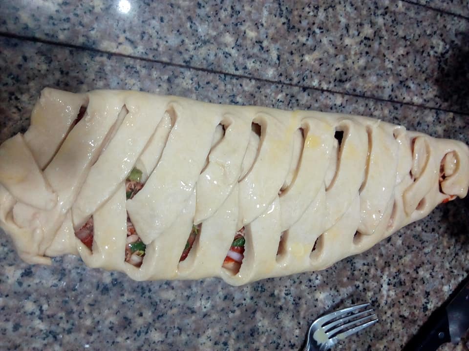 Mettre votre farce au milieu (j’ai mélangé du poisson haché avec carottes haricots vert oignon poivron ail poivre blanc ). Vous pouvez ajouter fromage .