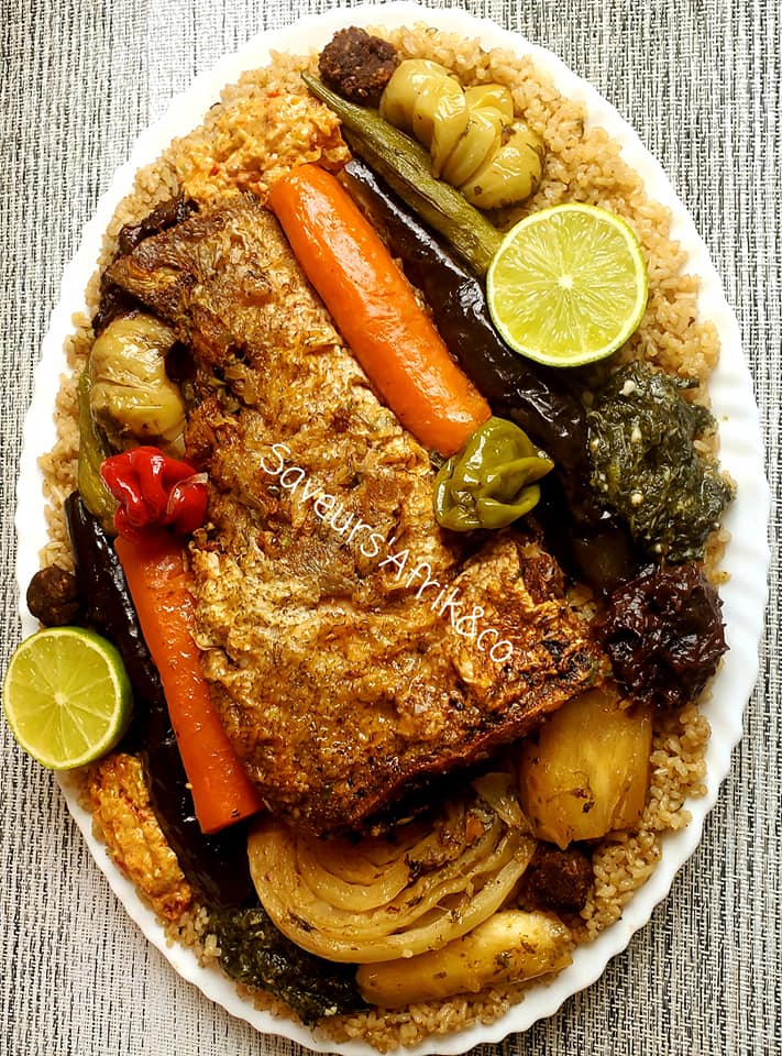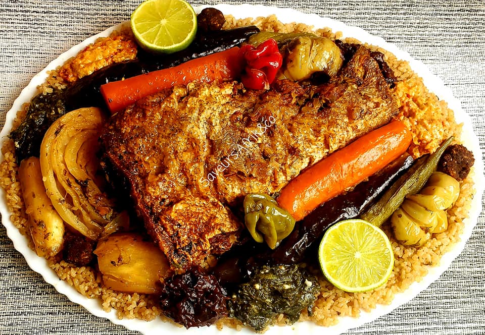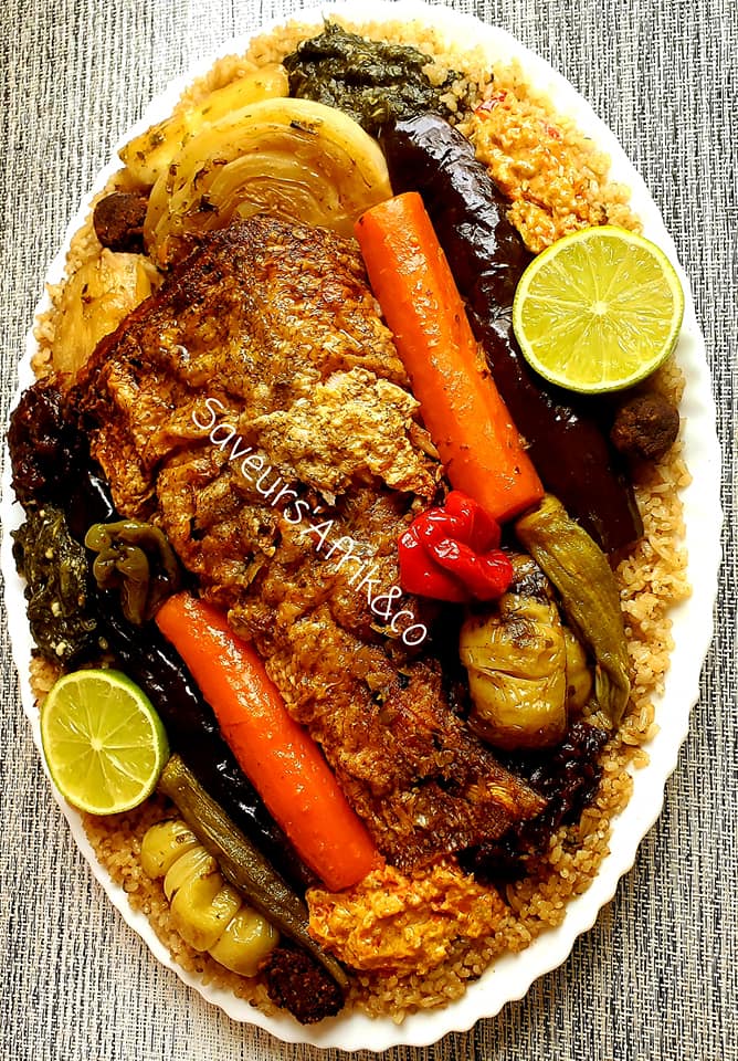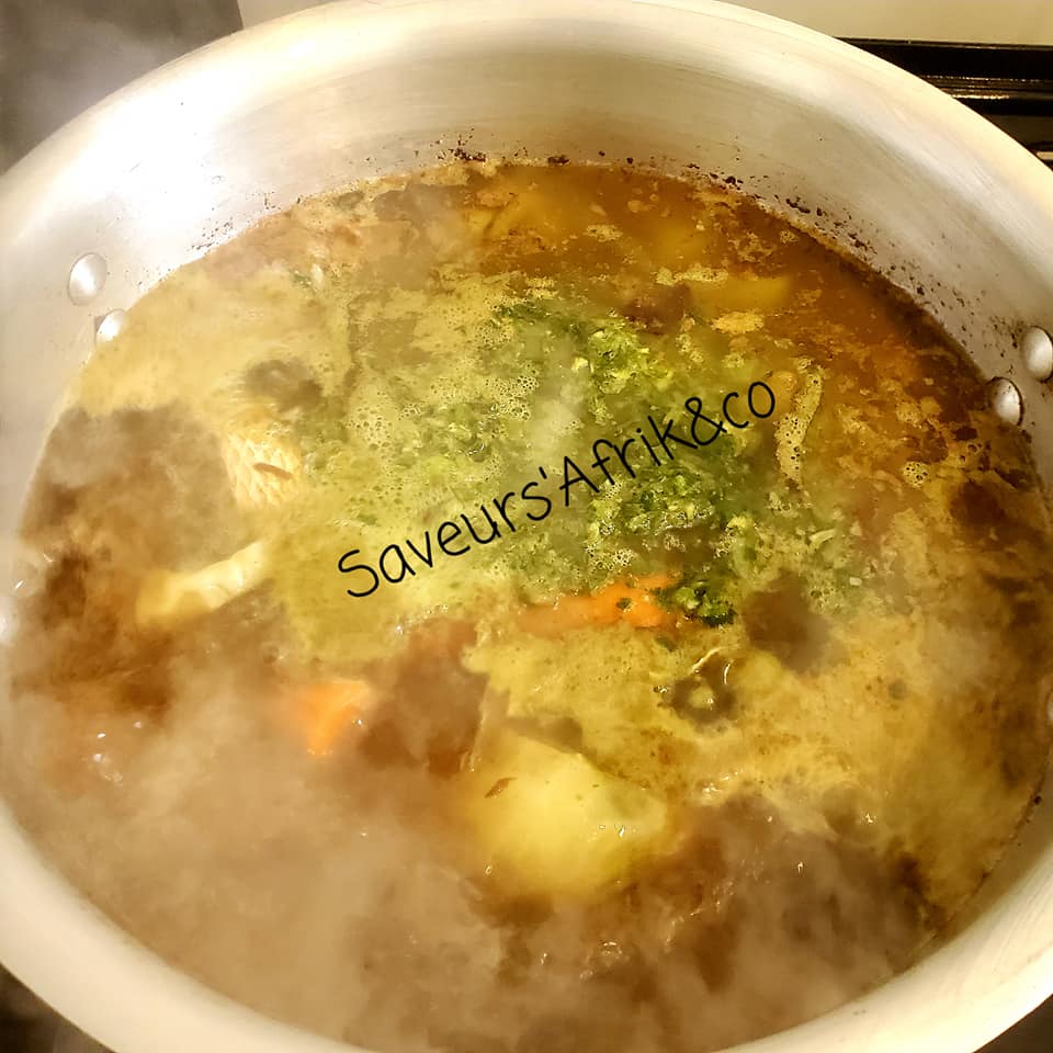 - Ajouter 1,5 litre d’eau, puis le poisson frit (mérou et magni), les légumes, le nokoss et porter à ébullition pendant 20 min.