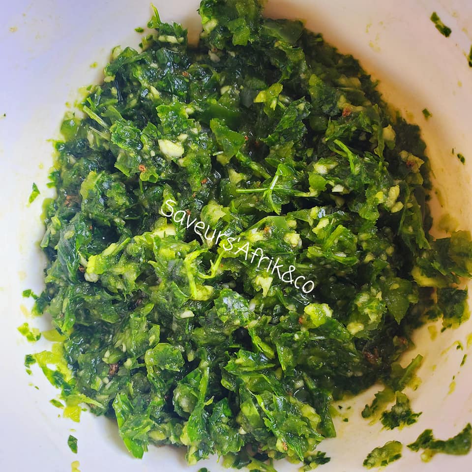 - Hacher ou piler au mortier une partie du persil, 1 poivron, 3 gousses d’ail, gingembre, cube