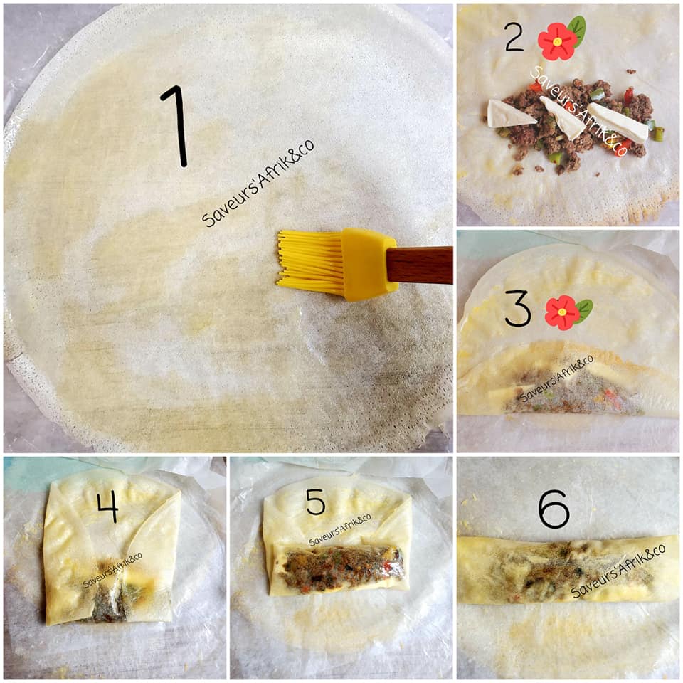 - Déplier une brick ( vous pouvez les découper en 4 si vous souhaitez avoir de petites formes), napper la feuilles de brick de beurre fondu, puis ajouter une cuillère à soupe de la farce viande hachée et ajouter un fromage, mouillez les bordures de la feuilles avec un peu d’eau et pliez comme un nem.(voir image de pliage).