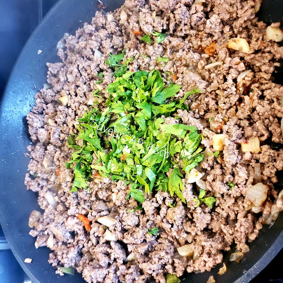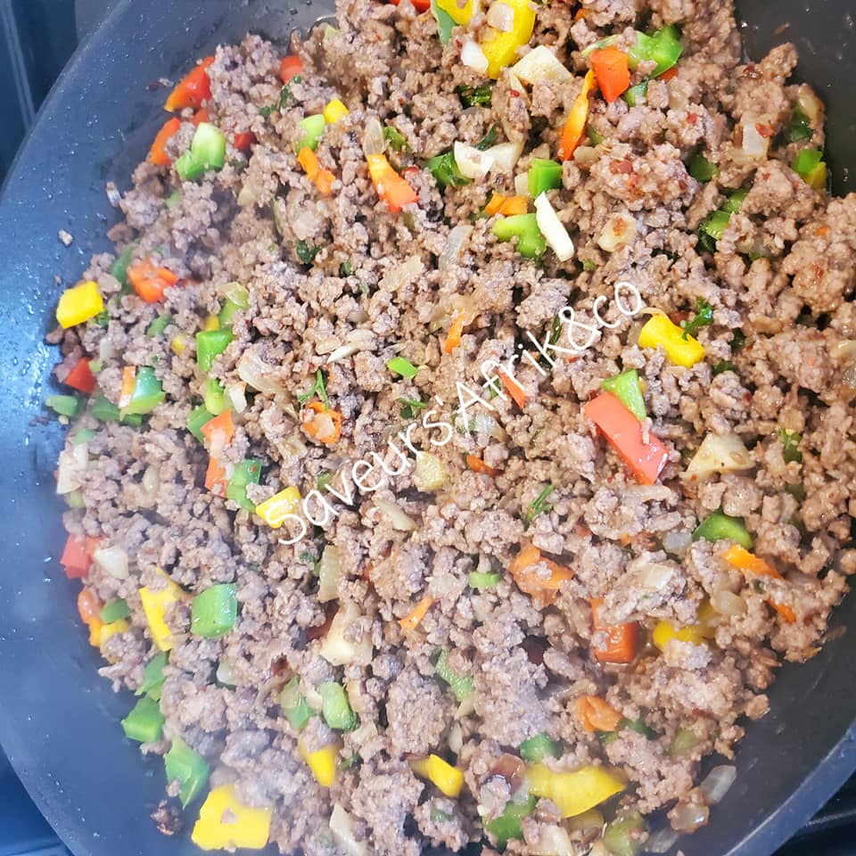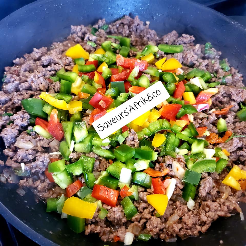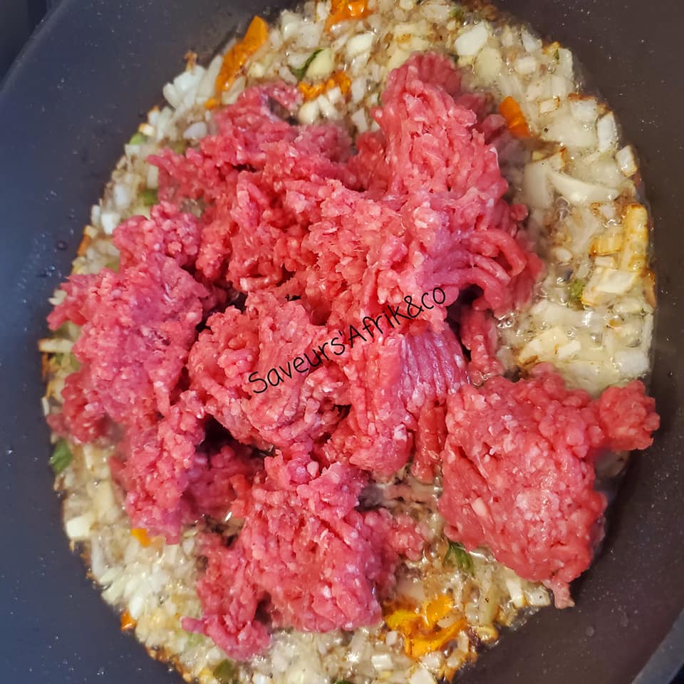 - Puis ajouter la viande hachée, laisser cuire pendant 10 min en rentrant régulièrement. Ensuite, ajouter les poivrons découpés, le sel, le poivre, le cumin, la coriandre et le persil, puis laisser cuire 10 min. C’est prêt.