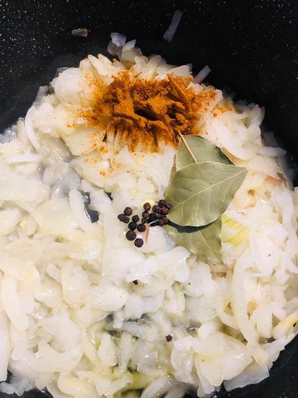 - Dans une petite marmite mettre 1 CàS d’huile d’olive et faire revenir les oignons et l’ail émincés ajoutez le poivre en grain le laurier et un peu de sel