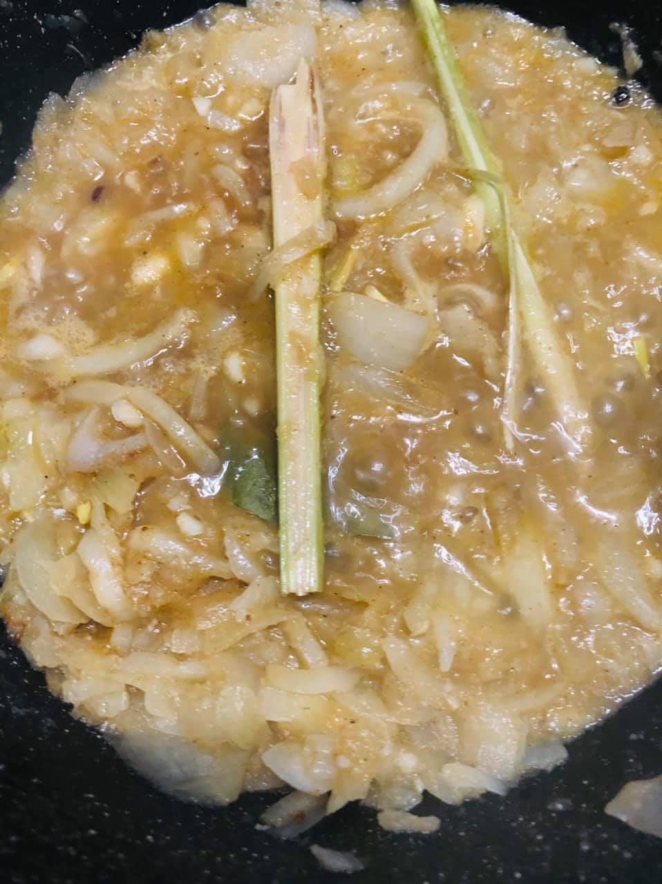 - Quand les oignons commence à doré ajoutez l’eau et la citronnelle laisser cuire 5 mns