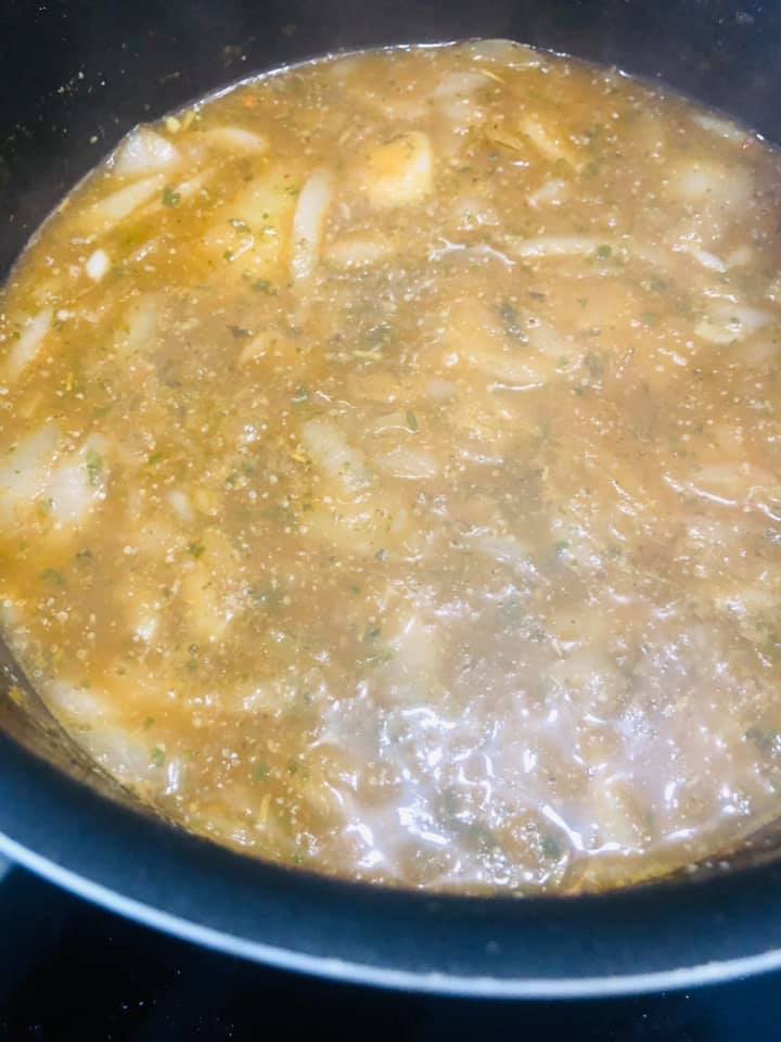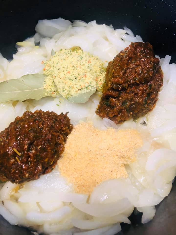 Dans une petite casserole faire revenir les oignons émincés dans 1 càs d’huile d’olive ajoutez les 2 càs de marinade le bouillon et les feuille de lauriers faire revenir au moins 5 mns