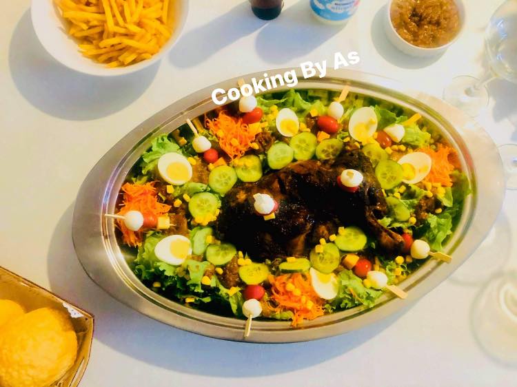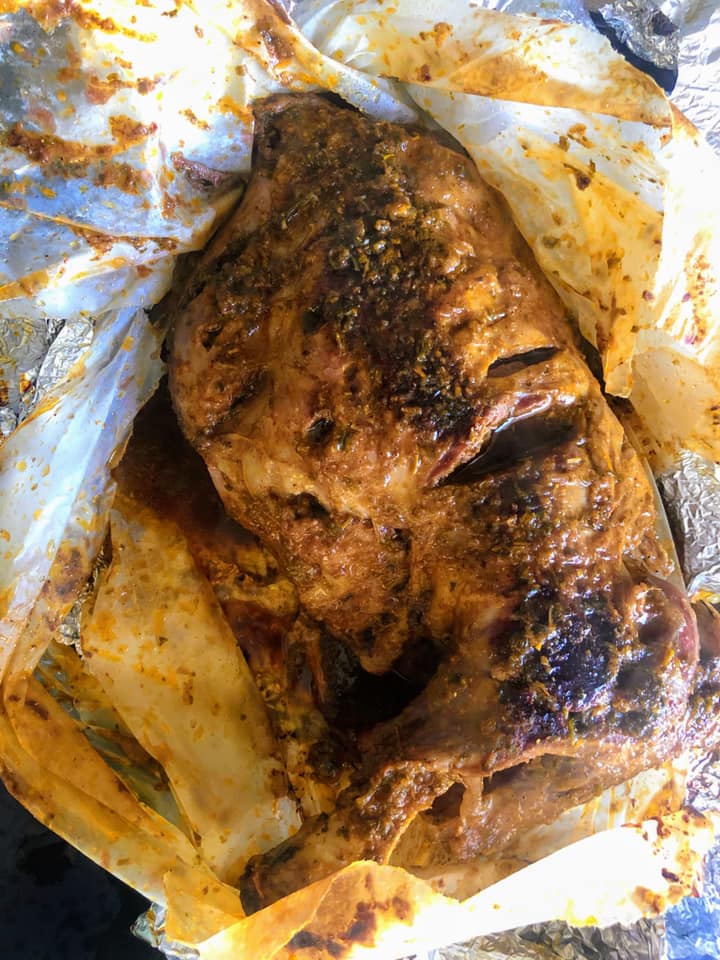 Retirez le haut de l’aluminium et du papier sulfurisé arrosez de son jus et remettre au four en mode grill 10/15 mns facultatif vous pouvez aussi prélevez un peu du jus et ajoutez à votre sauce oignons cela vous servira de vinaigrette pour la salade