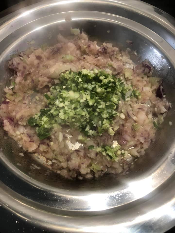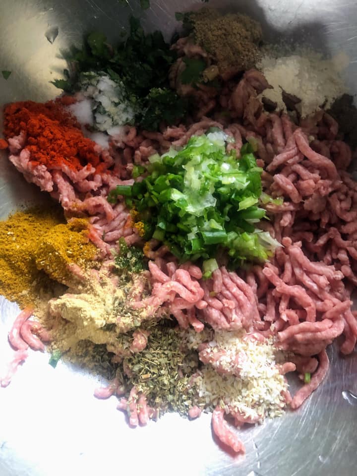 - Dans un bol mélanger la viande les épices ajoutez le petit oignon vert finement ciselé mélanger et laisser mariner un peu au frais ou pas