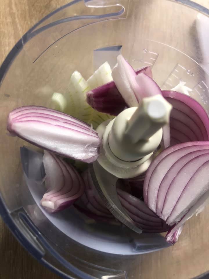 - Mixer l’oignon rouge et l’oignon vert mais réserver la tige verte vous la mixerez séparément avec l’ail et mixer aussi les tomates