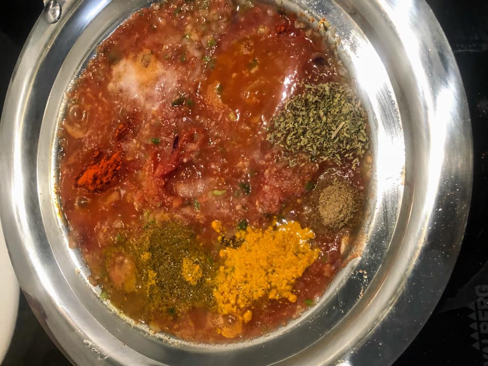 - Ajoutez la tomate mixer du curcuma de l’origan du paprika sel poivre