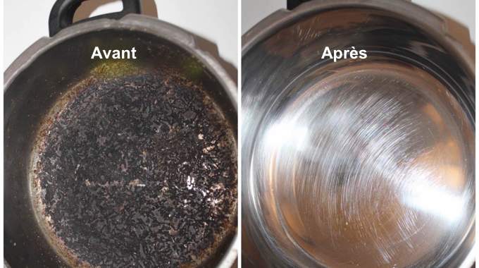 - En fonction du niveau de brûlure de votre récipient , l’opération peut être à renouveler. Il est fortement déconseillé, dans tous les cas, d’utiliser un abrasif pour enlever le brûlé du fond de la casserole ou de la poêle.