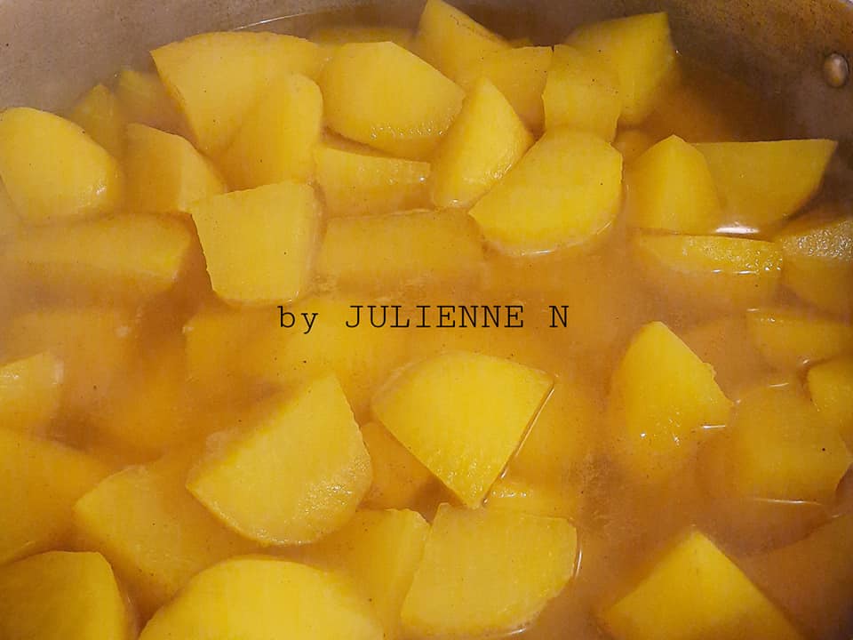 - Ensuite, les mettre à cuire avec 1 litre d’eau et le colorant alimentaire jaune dilué dedans, pendant 30 minutes.