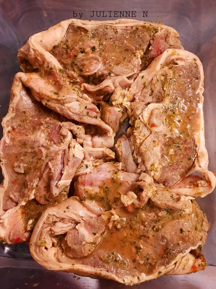 - Mariner la viande avec la persillade, le citron, le vinaigre, le cube, le sel et le poivre.