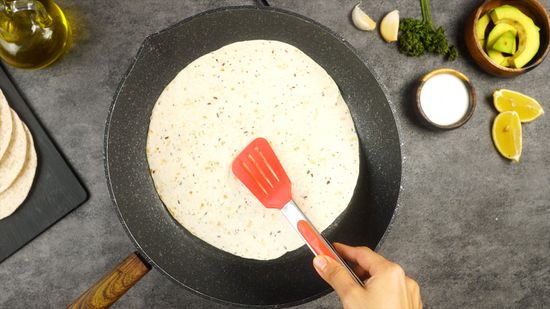 Faites simplement chauffer une poêle plus grande que le diamètre de vos tortillas à feu moyen à moyen-élevé. Il n’est pas nécessaire d’huiler la poêle, ni même de la vaporiser . Lorsque la poêle est chaude, placez la tortilla directement dans la poêle et chauffez pendant environ 45 secondes, jusqu’à ce que le fond soit doré par endroits.