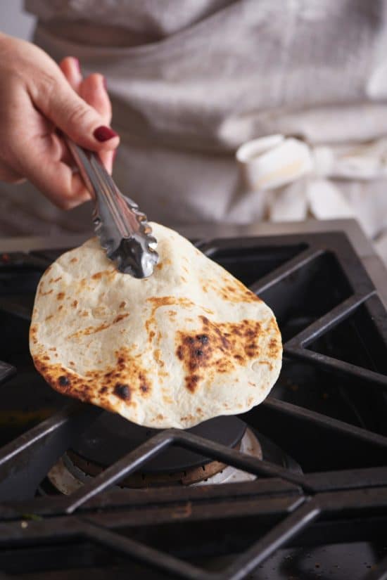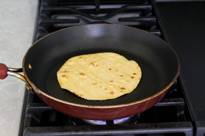 Ensuite, utilisez une pince ou une fourchette pour le retourner et réchauffez l’autre côté pendant environ 45 secondes. Retirer la tortilla sur une assiette ou une surface propre et répéter avec le reste des tortillas. Vous pouvez les empiler pendant qu’ils sont chauffés.